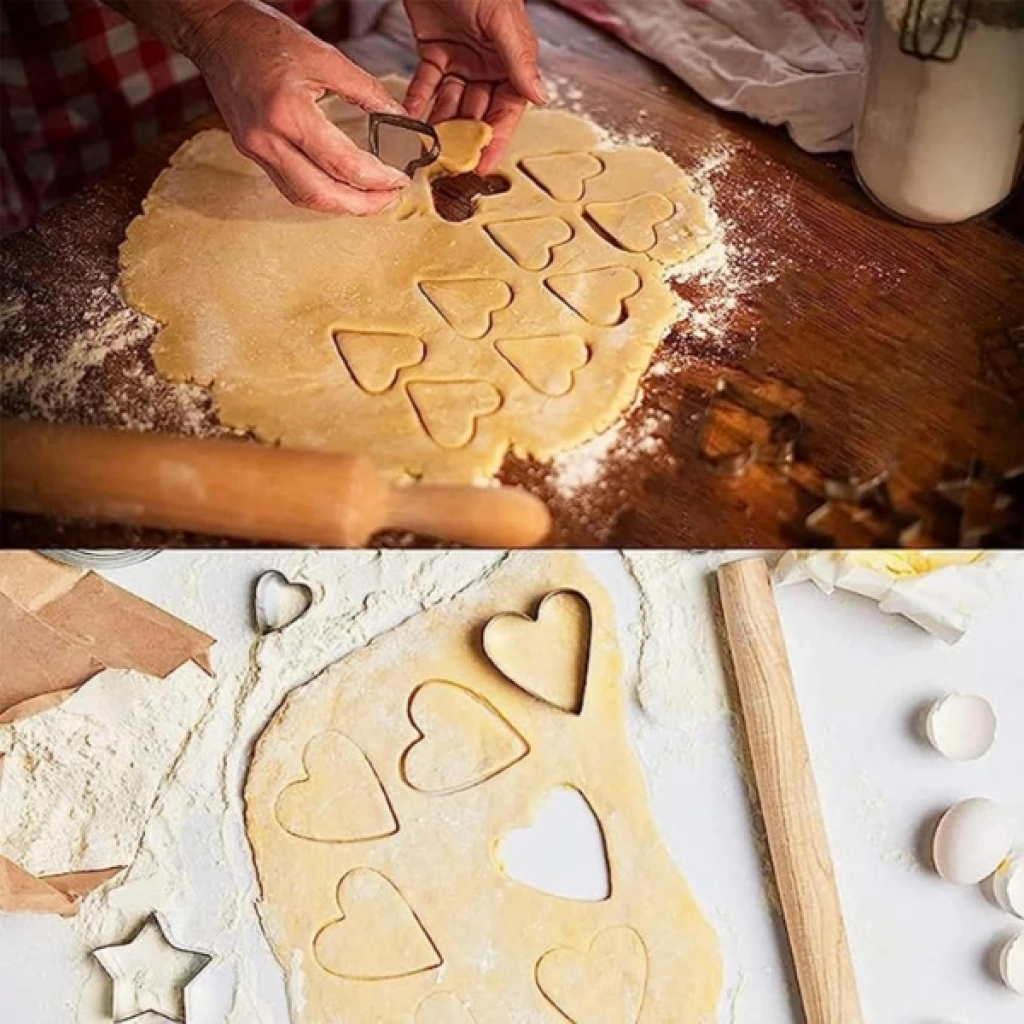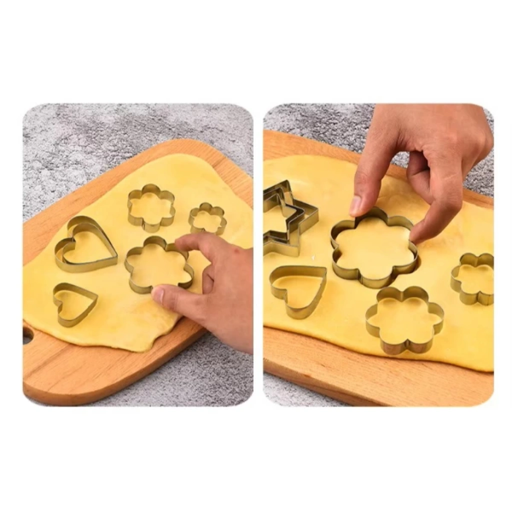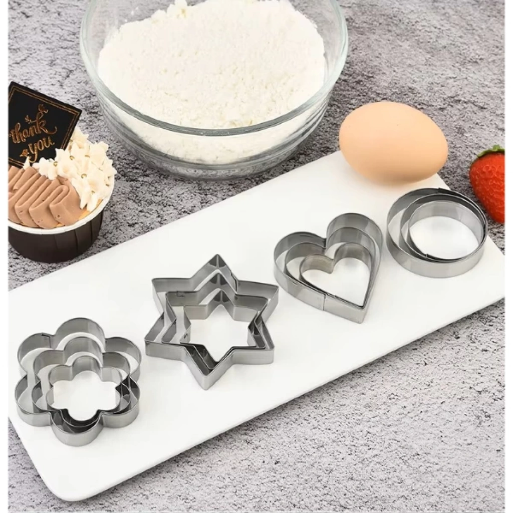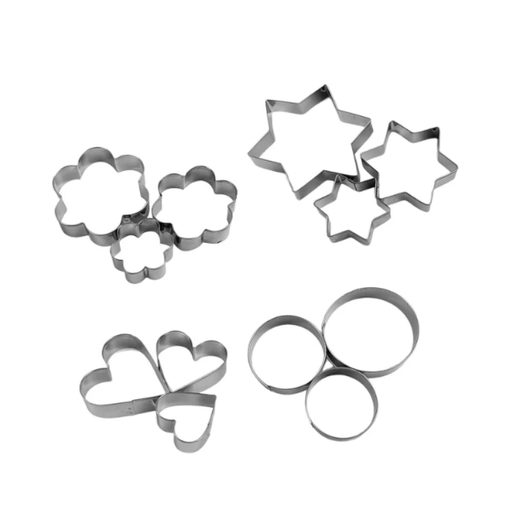 12 ADET PASLANMAZ ÇELİK KURABİYE KALIBI SETİÜrün Özellikleri 12 adet paslanmaz çelik kurabiye kalıbı seti, dayanıklı ve hijyenik yapısıyla mutfakta pratik kullanım sağlar. Kalpler, yıldızlar, çiçekler ve daireler gibi 4 farklı şekli bulunan bu set, her şeklin üç farklı boyutuyla toplam 12 parçadan oluşur. Yalnızca kurabiye hamuru için değil, aynı zamanda sebze, meyve, yumurta veya hamur işi sunumlarında da yaratıcı biçimlendirmeler yapmanıza imkân tanır. Paslanmaz çelik yapısı sayesinde uzun ömürlü kullanım sunar ve kolay temizlenir. Pürüzsüz kenarları sayesinde güvenli bir kullanım deneyimi sağlar. Evde, kafelerde veya pastanelerde dekoratif sunumlar yapmak isteyenler için ideal bir yardımcıdır. Paket İçeriği 1 adet 12’li paslanmaz çelik kurabiye kalıbı seti