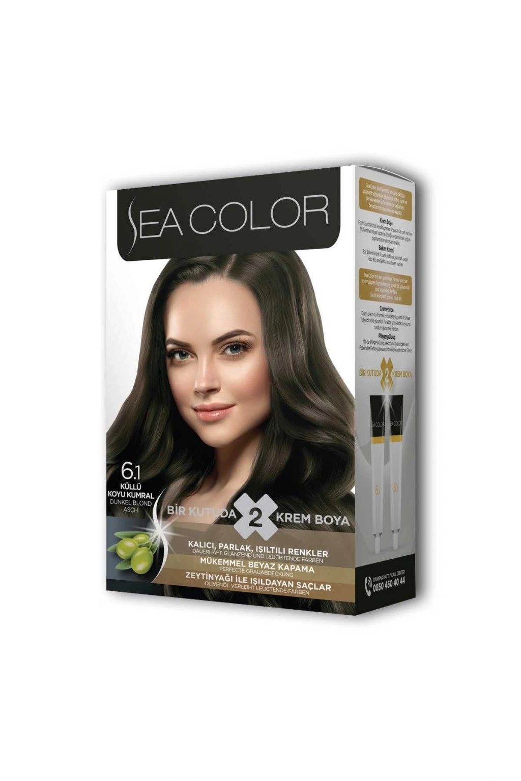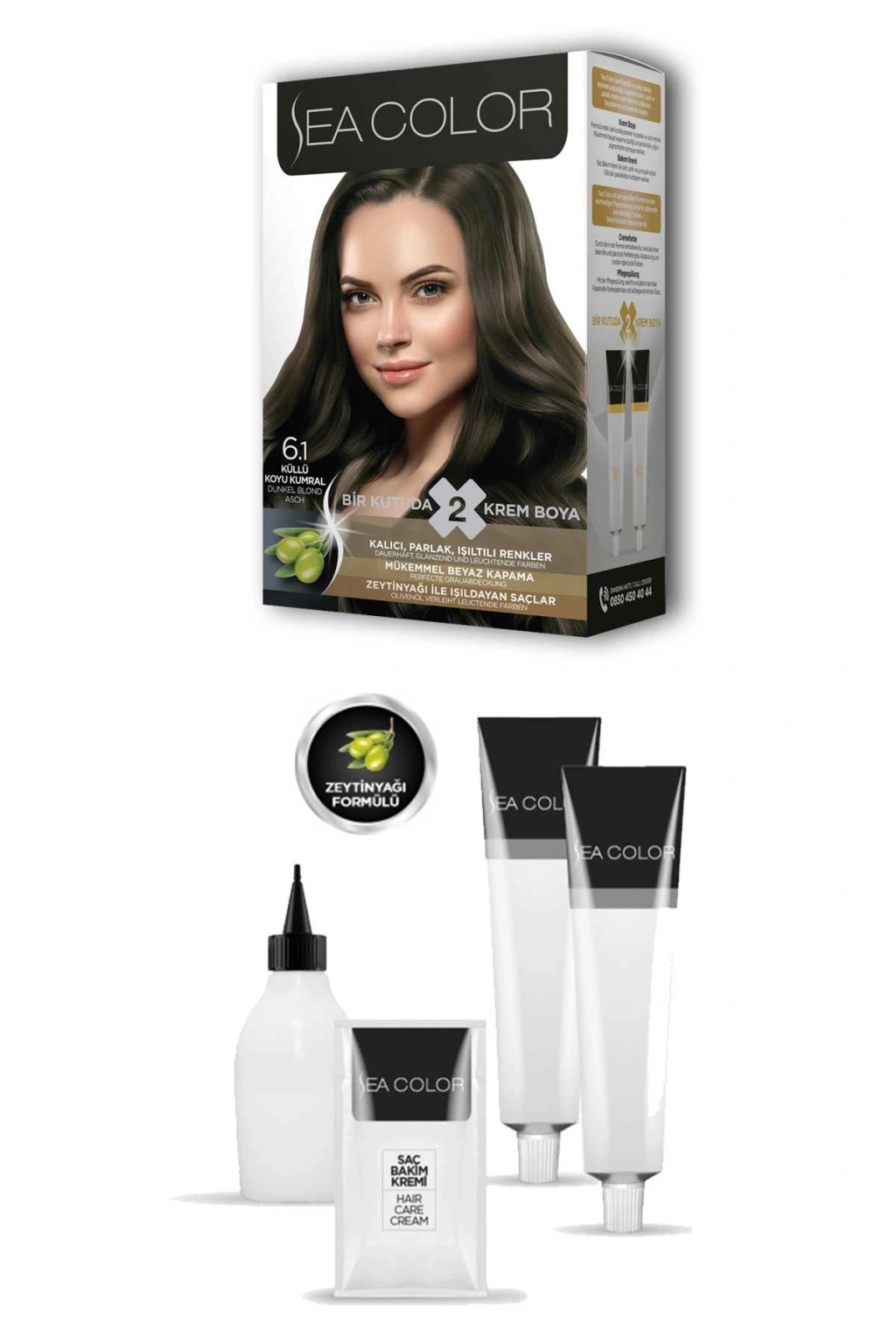 Sea Color 2 tüp Krem Saç Boyası Seti Küllü Koyu Kumral No:6.1 Zeytinyağlı özel formülü ile saçlarınızı boyarken ışıldayan saçlar elde edebilirsiniz. Canlandırıcı ve saç besleyici özelliğe sahiptir. Zengin renk seçeneğine sahip sea color tüp krem boya kalıcı, parlak ve ışıltıtılı saç boyası isteyenler için idealdir. Mükemmel beyaz kapama sayesinde dip boyalarınızda ve tüm boyamalarda gönül rahatlığı ile kullanabilirsiniz. Krem boya formülündeki özel kondisyonerler ile parlak ve canlı renkler, kusursuz beyaz kapama özelliği ve içerisindeki yoğun pigmentlerle solmayan renkler elde edebilirsiniz. Güneşte saçlarınızın ışıltısı göz alıcı olacak ve tüm dikkatleri üstünüze çekeceksiniz. Paket içerisinde bulunan saç bakım kremi sayesinde yumuşaklık ve ipeksi parlak görünüm sağlar. Kullanma prospektüsü kutunun iç kısmına basılıdır ilk defa kullanım için detaylı anlatım mevcuttur. Kutu üzerindeki OR kodunu telefonunuzdan okutarak uygulama videosuna da ulaşabilirsiniz. Işıltılı sağlıklı ve parlak saçlar için sea color tüp krem boya en ideal seçenek olacaktır. Mutlu ve güzel günlerde kullanmanız dileğiyle. Kutu içeriği: 2 adet tüp krem saç boyası ( 2x50 ml) 1 oksidan krem (75 ml) 1 saç bakım kremi ( 10 ml) 1 çift saç boyama eldiveni