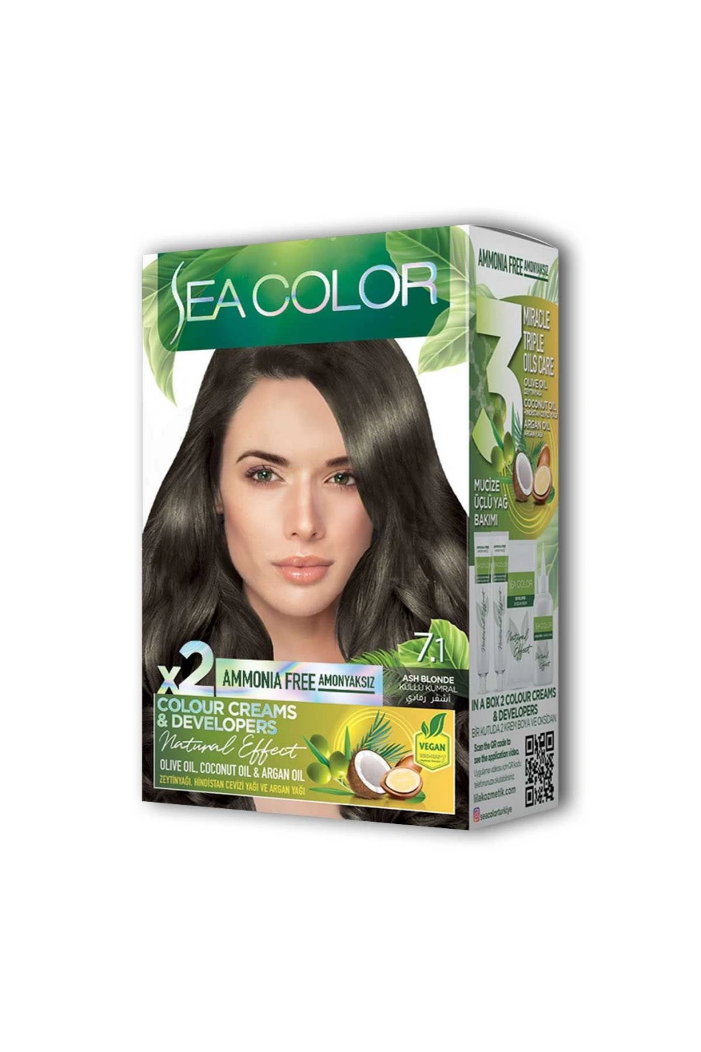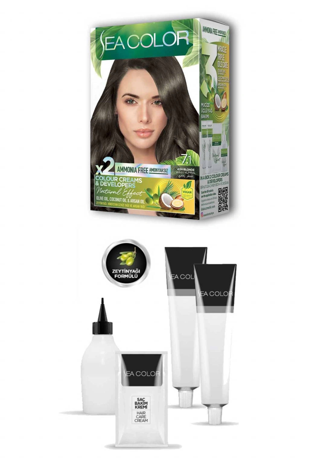 Sea Color 2 tüp Krem Saç Boyası Seti Küllü Kumral No:7.1 Zeytinyağlı özel formülü ile saçlarınızı boyarken ışıldayan saçlar elde edebilirsiniz. Canlandırıcı ve saç besleyici özelliğe sahiptir. Zengin renk seçeneğine sahip sea color tüp krem boya kalıcı, parlak ve ışıltıtılı saç boyası isteyenler için idealdir. Mükemmel beyaz kapama sayesinde dip boyalarınızda ve tüm boyamalarda gönül rahatlığı ile kullanabilirsiniz. Krem boya formülündeki özel kondisyonerler ile parlak ve canlı renkler, kusursuz beyaz kapama özelliği ve içerisindeki yoğun pigmentlerle solmayan renkler elde edebilirsiniz. Güneşte saçlarınızın ışıltısı göz alıcı olacak ve tüm dikkatleri üstünüze çekeceksiniz. Paket içerisinde bulunan saç bakım kremi sayesinde yumuşaklık ve ipeksi parlak görünüm sağlar. Kullanma prospektüsü kutunun iç kısmına basılıdır ilk defa kullanım için detaylı anlatım mevcuttur. Kutu üzerindeki OR kodunu telefonunuzdan okutarak uygulama videosuna da ulaşabilirsiniz. Işıltılı sağlıklı ve parlak saçlar için sea color tüp krem boya en ideal seçenek olacaktır. Mutlu ve güzel günlerde kullanmanız dileğiyle. Kutu içeriği: 2 adet tüp krem saç boyası ( 2x50 ml) 1 oksidan krem (75 ml) 1 saç bakım kremi ( 10 ml) 1 çift saç boyama eldiveni