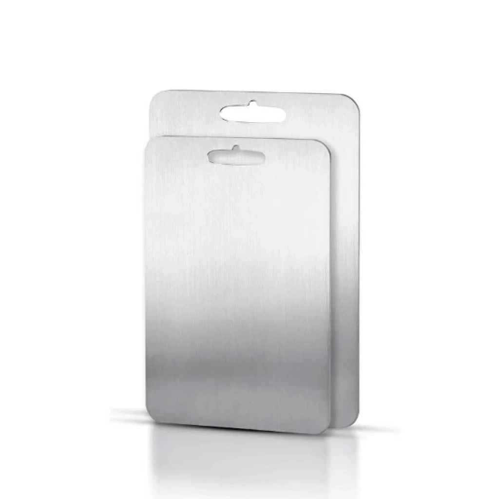 2'Lİ PASLANMAZ ÇELİK KESİM PANOSU SETİÜrün Özellikleri 2’li paslanmaz çelik kesim panosu seti, mutfakta hijyenik ve uzun ömürlü kullanım için özel olarak tasarlanmıştır. 18/10 304 kalite paslanmaz çelikten üretilmiş olan bu panolar, gıda için en uygun ve sağlıklı çelikten üretilmiştir, çift taraf skoçlu yüzeyleri sayesinde her iki yüzeyi de kesim için kullanıma uygundur. 0.90 mm kalınlığıyla sağlam ve dayanıklıdır, kolay kolay deformasyon göstermez. Antibakteriyel yapısı sayesinde gıda güvenliğini destekler ve yüzeyi leke tutmaz. Büyük boy 33x23 cm, küçük boy ise 28x20 cm ölçülerindedir. Kırılmaz yapısı ve sağlıklı kullanım özelliği ile mutfakta güvenli bir çözüm sunar. Elde ya da bulaşık makinesinde kolayca yıkanabilir. Paket İçeriği 1 adet büyük boy paslanmaz çelik kesim panosu (33x23 cm) 1 adet küçük boy paslanmaz çelik kesim panosu (28x20 cm)