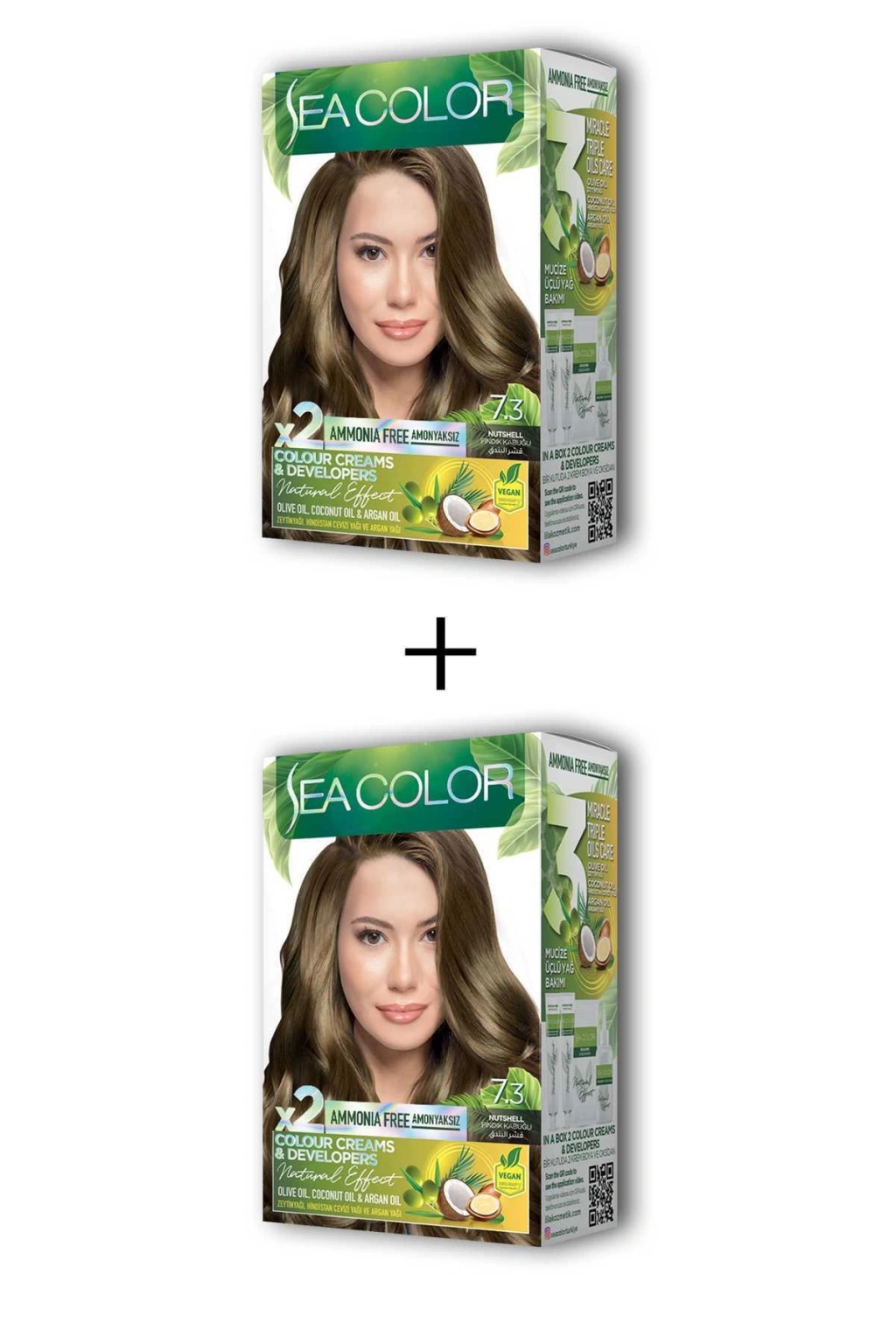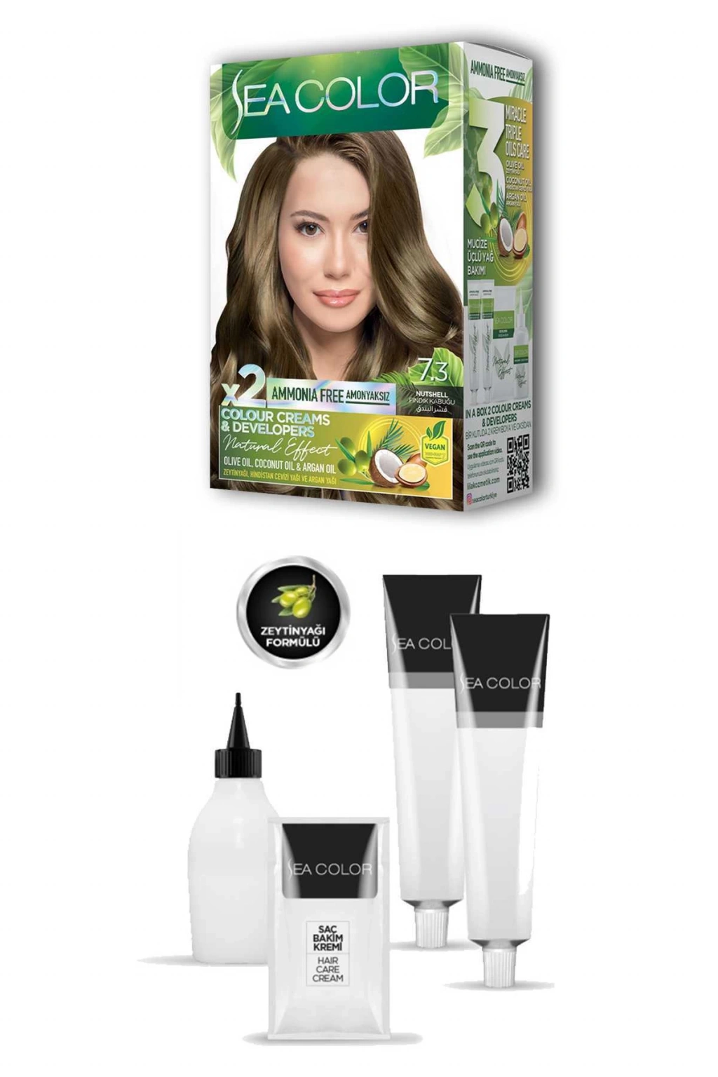 Sea Color 2X2 tüp Krem Saç Boyası Seti Fındık Kabuğu No:7.3 Zeytinyağlı özel formülü ile saçlarınızı boyarken ışıldayan saçlar elde edebilirsiniz. Canlandırıcı ve saç besleyici özelliğe sahiptir. Zengin renk seçeneğine sahip sea color tüp krem boya kalıcı, parlak ve ışıltıtılı saç boyası isteyenler için idealdir. Mükemmel beyaz kapama sayesinde dip boyalarınızda ve tüm boyamalarda gönül rahatlığı ile kullanabilirsiniz. Krem boya formülündeki özel kondisyonerler ile parlak ve canlı renkler, kusursuz beyaz kapama özelliği ve içerisindeki yoğun pigmentlerle solmayan renkler elde edebilirsiniz. Güneşte saçlarınızın ışıltısı göz alıcı olacak ve tüm dikkatleri üstünüze çekeceksiniz. Paket içerisinde bulunan saç bakım kremi sayesinde yumuşaklık ve ipeksi parlak görünüm sağlar. Kullanma prospektüsü kutunun iç kısmına basılıdır ilk defa kullanım için detaylı anlatım mevcuttur. Kutu üzerindeki OR kodunu telefonunuzdan okutarak uygulama videosuna da ulaşabilirsiniz. Işıltılı sağlıklı ve parlak saçlar için sea color tüp krem boya en ideal seçenek olacaktır. Mutlu ve güzel günlerde kullanmanız dileğiyle. Kutu içeriği: 2X2 adet tüp krem saç boyası ( 2x50 ml) 2X1 oksidan krem (75 ml) 2X1 saç bakım kremi ( 10 ml) 2X1 çift saç boyama eldiveni