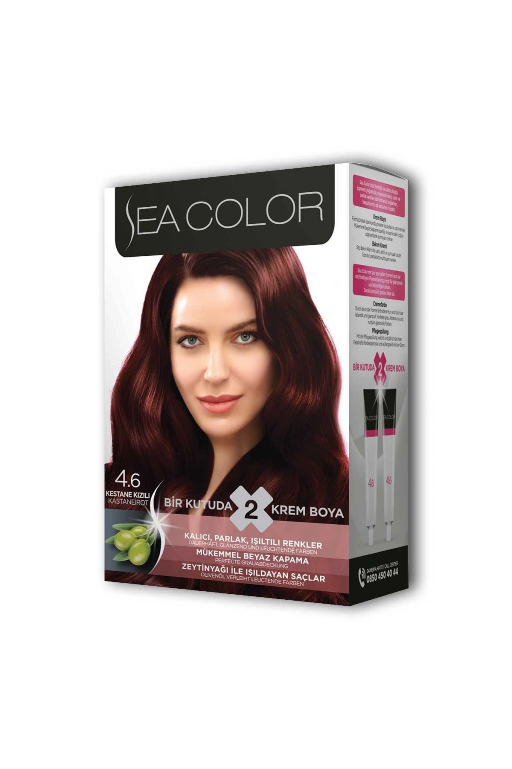 Sea Color 2X2 tüp Krem Saç Boyası Seti Kestane Kızılı No:4.6 Zeytinyağlı özel formülü ile saçlarınızı boyarken ışıldayan saçlar elde edebilirsiniz. Canlandırıcı ve saç besleyici özelliğe sahiptir. Zengin renk seçeneğine sahip sea color tüp krem boya kalıcı, parlak ve ışıltıtılı saç boyası isteyenler için idealdir. Mükemmel beyaz kapama sayesinde dip boyalarınızda ve tüm boyamalarda gönül rahatlığı ile kullanabilirsiniz. Krem boya formülündeki özel kondisyonerler ile parlak ve canlı renkler, kusursuz beyaz kapama özelliği ve içerisindeki yoğun pigmentlerle solmayan renkler elde edebilirsiniz. Güneşte saçlarınızın ışıltısı göz alıcı olacak ve tüm dikkatleri üstünüze çekeceksiniz. Paket içerisinde bulunan saç bakım kremi sayesinde yumuşaklık ve ipeksi parlak görünüm sağlar. Kullanma prospektüsü kutunun iç kısmına basılıdır ilk defa kullanım için detaylı anlatım mevcuttur. Kutu üzerindeki OR kodunu telefonunuzdan okutarak uygulama videosuna da ulaşabilirsiniz. Işıltılı sağlıklı ve parlak saçlar için sea color tüp krem boya en ideal seçenek olacaktır. Mutlu ve güzel günlerde kullanmanız dileğiyle. Kutu içeriği: 2X2 adet tüp krem saç boyası ( 2x50 ml) 2X1 oksidan krem (75 ml) 2X1 saç bakım kremi ( 10 ml) 2X1 çift saç boyama eldiveni