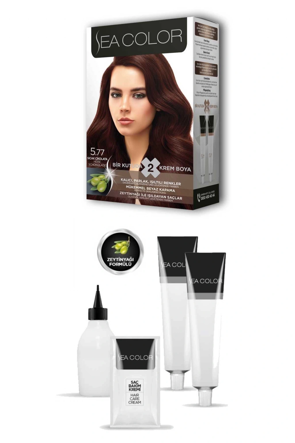 Sea Color 2X2 tüp Krem Saç Boyası Seti Sıcak Çikolata No:5.77 Zeytinyağlı özel formülü ile saçlarınızı boyarken ışıldayan saçlar elde edebilirsiniz. Canlandırıcı ve saç besleyici özelliğe sahiptir. Zengin renk seçeneğine sahip sea color tüp krem boya kalıcı, parlak ve ışıltıtılı saç boyası isteyenler için idealdir. Mükemmel beyaz kapama sayesinde dip boyalarınızda ve tüm boyamalarda gönül rahatlığı ile kullanabilirsiniz. Krem boya formülündeki özel kondisyonerler ile parlak ve canlı renkler, kusursuz beyaz kapama özelliği ve içerisindeki yoğun pigmentlerle solmayan renkler elde edebilirsiniz. Güneşte saçlarınızın ışıltısı göz alıcı olacak ve tüm dikkatleri üstünüze çekeceksiniz. Paket içerisinde bulunan saç bakım kremi sayesinde yumuşaklık ve ipeksi parlak görünüm sağlar. Kullanma prospektüsü kutunun iç kısmına basılıdır ilk defa kullanım için detaylı anlatım mevcuttur. Kutu üzerindeki OR kodunu telefonunuzdan okutarak uygulama videosuna da ulaşabilirsiniz. Işıltılı sağlıklı ve parlak saçlar için sea color tüp krem boya en ideal seçenek olacaktır. Mutlu ve güzel günlerde kullanmanız dileğiyle. Kutu içeriği: 2X2 adet tüp krem saç boyası ( 2x50 ml) 2X1 oksidan krem (75 ml) 2X1 saç bakım kremi ( 10 ml) 2X1 çift saç boyama eldiveni
