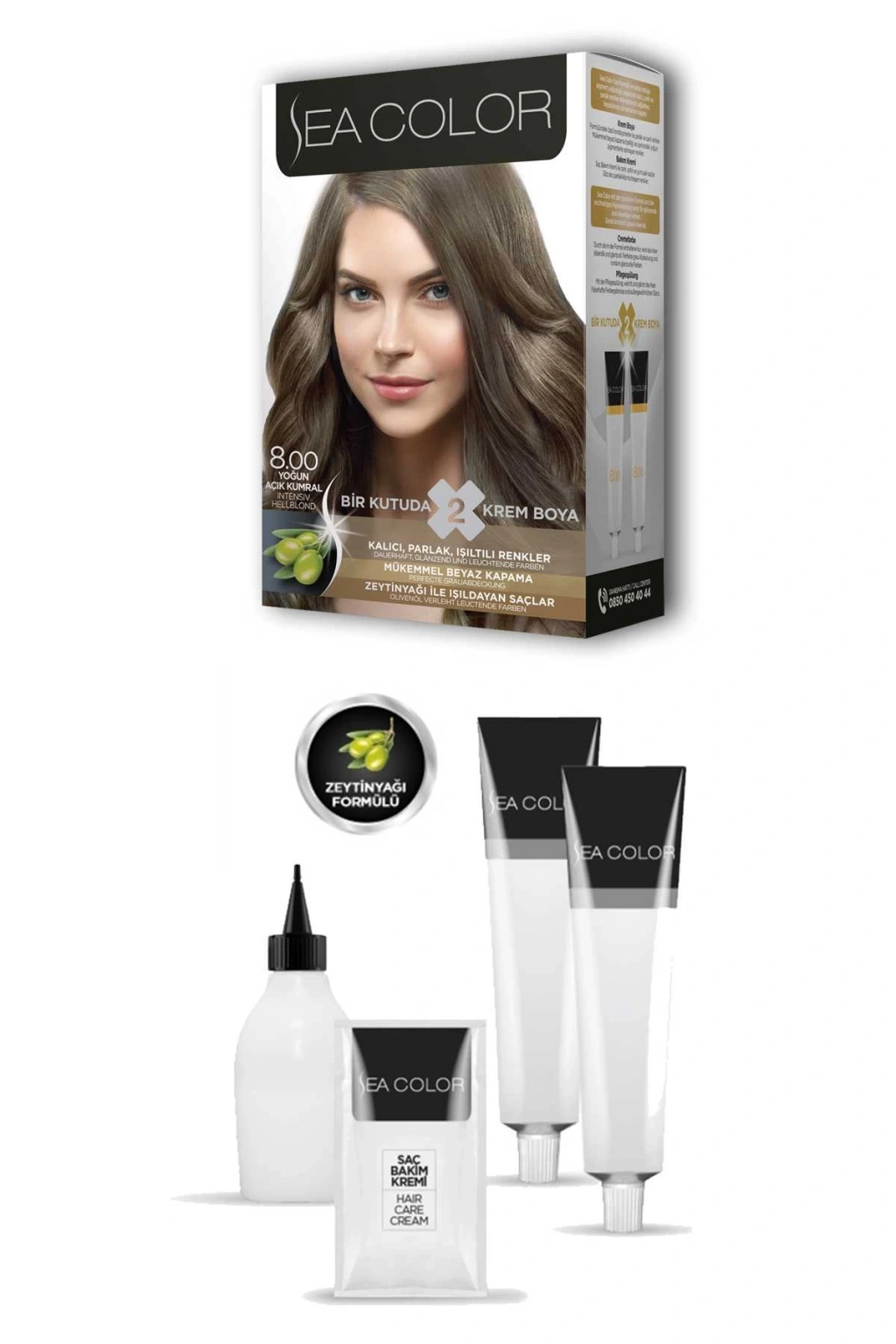 Sea Color 2X2 tüp Krem Saç Boyası Seti Yoğun Açık Kumral No:8.00 Zeytinyağlı özel formülü ile saçlarınızı boyarken ışıldayan saçlar elde edebilirsiniz. Canlandırıcı ve saç besleyici özelliğe sahiptir. Zengin renk seçeneğine sahip sea color tüp krem boya kalıcı, parlak ve ışıltıtılı saç boyası isteyenler için idealdir. Mükemmel beyaz kapama sayesinde dip boyalarınızda ve tüm boyamalarda gönül rahatlığı ile kullanabilirsiniz. Krem boya formülündeki özel kondisyonerler ile parlak ve canlı renkler, kusursuz beyaz kapama özelliği ve içerisindeki yoğun pigmentlerle solmayan renkler elde edebilirsiniz. Güneşte saçlarınızın ışıltısı göz alıcı olacak ve tüm dikkatleri üstünüze çekeceksiniz. Paket içerisinde bulunan saç bakım kremi sayesinde yumuşaklık ve ipeksi parlak görünüm sağlar. Kullanma prospektüsü kutunun iç kısmına basılıdır ilk defa kullanım için detaylı anlatım mevcuttur. Kutu üzerindeki OR kodunu telefonunuzdan okutarak uygulama videosuna da ulaşabilirsiniz. Işıltılı sağlıklı ve parlak saçlar için sea color tüp krem boya en ideal seçenek olacaktır. Mutlu ve güzel günlerde kullanmanız dileğiyle. Kutu içeriği: 2X2 adet tüp krem saç boyası ( 2x50 ml) 2X1 oksidan krem (75 ml) 2X1 saç bakım kremi ( 10 ml) 2X1 çift saç boyama eldiveni