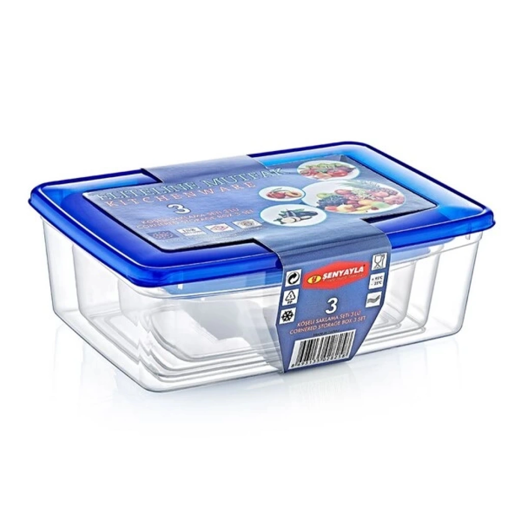 3'LÜ KÖŞELİ SAKLAMA KABI SETİÜrün Özellikleri Mutfakta düzeni ve hijyeni ön planda tutanlar için ideal olan 3’lü Köşeli Saklama Kabı Seti, farklı boyutlardaki üç ayrı kutusuyla geniş bir kullanım alanı sunar. Set içerisinde 20x13,5x7 cm, 24x16,5x8,5 cm ve 27,5x19,5x9,5 cm boyutlarında üç adet saklama kabı bulunur.Her biri şeffaf gövdesi sayesinde içerisindekileri kolayca görmenizi sağlar. Sızdırmaz mavi kapakları, gıdaların tazeliğini uzun süre korur ve dolaplarda, buzdolabında ya da derin dondurucuda güvenle kullanılabilir. BPA içermeyen dayanıklı plastikten üretilmiştir, gıda ile temasa uygundur. Hafif ve sağlam yapısı sayesinde taşıması kolaydır.Bu set; yemek, salata, kahvaltılık, meyve veya atıştırmalıklarınızı muhafaza etmede mükemmel bir yardımcıdır. Aynı zamanda piknik ve seyahatlerde pratik bir çözüm sunar. Paket İçeriği 1 adet 20x13,5x7 cm saklama kabı 1 adet 24x16,5x8,5 cm saklama kabı 1 adet 27,5x19,5x9,5 cm saklama kabı