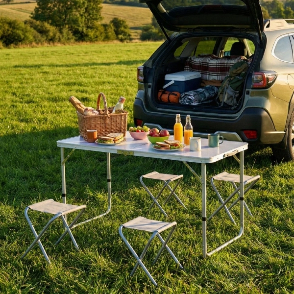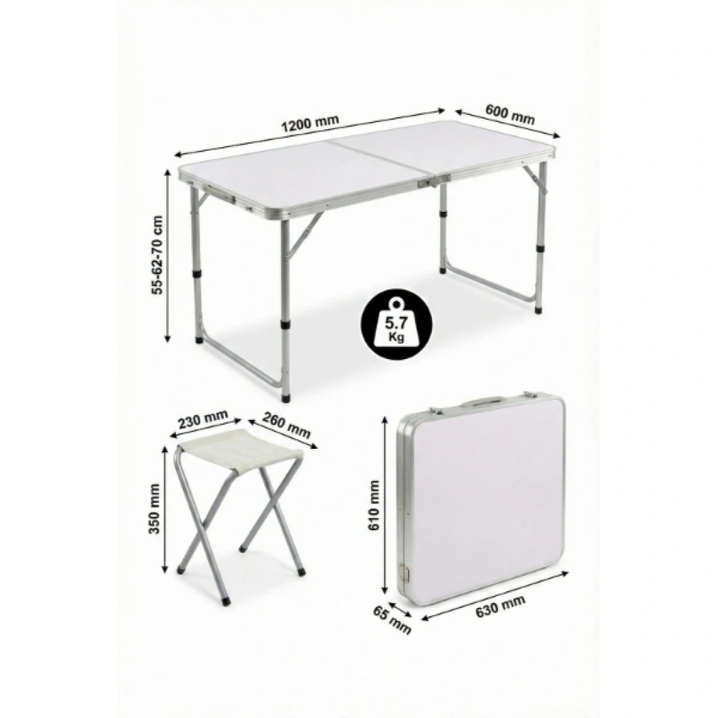 4 SANDALYELİ KATLANABİLİR MASA SETİ Ürün Özellikleri 4 Sandalyeli Katlanabilir Masa Seti, doğa tutkunları ve açık hava organizasyonları için tasarlanmış, pratikliği ve konforu bir arada sunan eksiksiz bir çözümdür. Akıllı "çanta tipi" tasarımı sayesinde, 4 adet katlanabilir sandalye masanın içerisine sığar ve set kapandığında şık bir el çantası formunu alır. Hafif alüminyum gövdesi ve sadece 5.7 kg ağırlığı ile elde kolayca taşınabilir, araç bagajlarında minimum yer kaplar. Masanın 55, 62 ve 70 cm olmak üzere 3 kademeli ayarlanabilir yüksekliği, hem çocukların hem de yetişkinlerin kullanımına uygun ergonomik bir deneyim sunar. Dayanıklı üst tabla yüzeyi kolayca silinebilirken, sağlam metal ayaklar engebeli zeminlerde bile denge sağlar. Piknikten kampa, plajdan bahçe partilerine kadar geniş bir kullanım alanına sahip olan bu katlanabilir kamp masası seti, hızlı kurulum mekanizması ile saniyeler içinde kullanıma hazır hale gelir. Uzun ömürlü kumaş yüzeye sahip tabureleri ve paslanmaya dayanıklı iskelet yapısıyla bu set, açık havada geçirdiğiniz her anı çok daha keyifli ve organize bir hale getirir. Ürün Teknik Özellikleri Özellik Açıklama Ürün Adı 4 Sandalyeli Katlanabilir Kamp Masa Seti Masa Boyutları 1200 mm (Boy) x 600 mm (En) Ayarlanabilir Yükseklik 55 cm / 62 cm / 70 cm (3 Kademe) Tabure Boyutları 350 mm (Yükseklik) x 230 mm x 260 mm Kapalı Çanta Boyutu 630 mm x 610 mm x 65 mm Toplam Ağırlık 5.7 Kg Malzeme Yüksek Kaliteli Alüminyum ve Dayanıklı Kumaş Kullanım Alanı Kamp, Piknik, Bahçe, Balkon, Plaj Paket İçeriği 1 Adet Katlanabilir Çanta Tipi Masa4 Adet Katlanabilir Metal Tabure