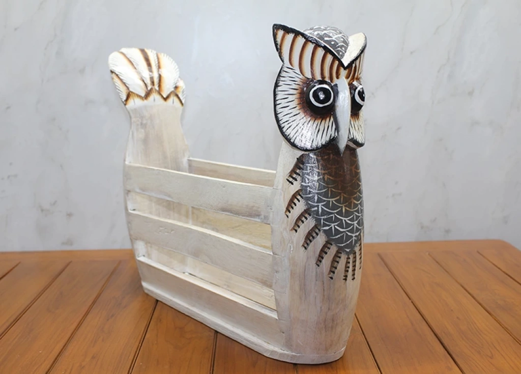 • AHŞAP BAYKUŞ GAZETELİKÜrün ÖzellikleriDoğal ahşaptan üretilen baykuş figürlü gazetelik, 33x43 cm boyutundadır. Estetik ve dekoratif tasarımıyla gazete, dergi ve kitaplarınızı düzenli bir şekilde saklamanızı sağlar. El işçiliğiyle özenle hazırlanmış o