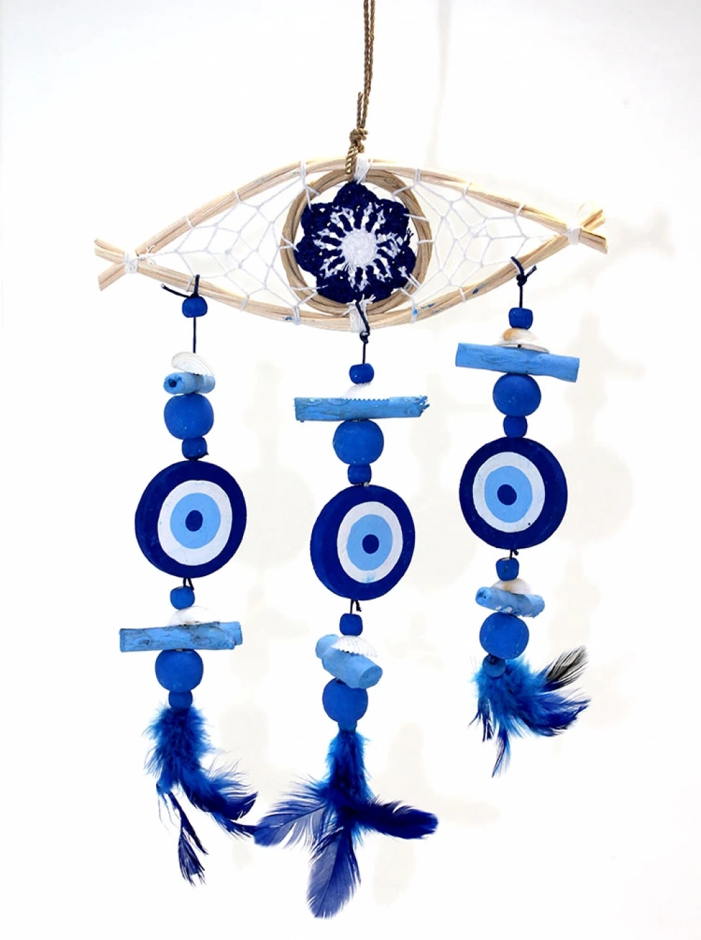 AHŞAP RÜZGAR ÇANI NO:5Ürün ÖzellikleriAhşap Rüzgar Çanı No:5, nazar boncuğu ve mavi tüy detayları ile şık bir tasarıma sahip, doğal ahşap malzeme kullanılarak üretilmiştir. Nazar boncuğu, kötü enerjilerden korunmayı simgelerken, mavi tüy detayları ise huzur ve pozitif enerjiyi temsil eder. Rüzgarla hareket ettiğinde, hoş ve melodik bir ses çıkararak etrafınıza huzur verici bir atmosfer yaratır. Bahçe, balkon veya iç mekanlarda rahatlıkla kullanılabilir. Hem dekoratif hem de fonksiyonel olan bu rüzgar çanı, estetik ve koruyucu özellikleriyle harika bir hediye seçeneği sunar.Paket İçeriği1 adet Ahşap Rüzgar Çanı No:5