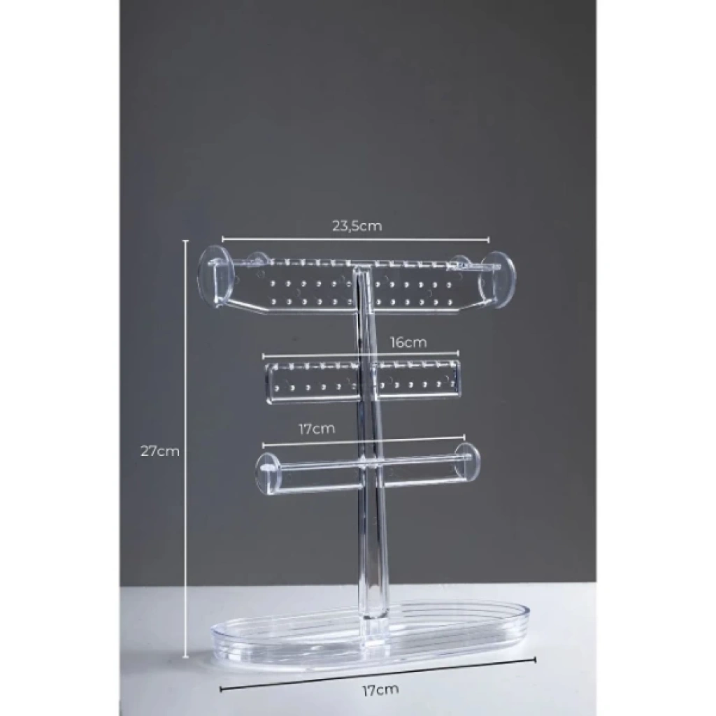 AKSESUAR STANDI TAKI ORGANIZERÜrün Özellikleri Aksesuar standı takı organizer, şık ve fonksiyonel tasarımıyla küpe, kolye, bileklik ve yüzüklerinizi düzenli bir şekilde sergilemenizi sağlar. 23,5 cm üst genişlik, 16 cm orta kısım ve 17 cm alt genişliği ile farklı boyutlardaki takılar için ideal kullanım sunar. Toplam yüksekliği 27 cm olan bu stand, şeffaf ve dayanıklı plastikten üretilmiştir. Hem evde hem de mağaza vitrinlerinde kullanılabilir. Takılarınızın dolaşmasını önler ve düzenli bir görünüm elde etmenizi sağlar. Paket İçeriği 1 adet Aksesuar Standı Takı Organizer