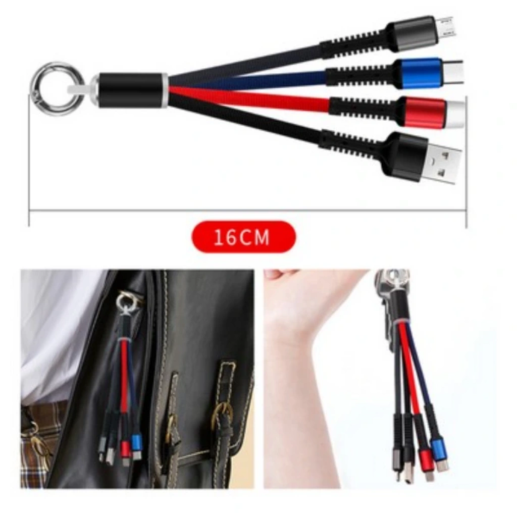 ANAHTARLIK ÇOKLU ŞARJ KABLOSU 4 BAŞLIKLIÜrün Özellikleri Anahtarlık Şarj Kablosu 4 Başlıklı model, kompakt tasarımıyla günlük yaşamda yanınızdan ayırmayacağınız pratik bir şarj çözümüdür. Lightning, Type-C ve Micro USB olmak üzere toplam 4 farklı başlığa sahip olması sayesinde neredeyse tüm cihazlarla uyumluluk sunar. Tek kabloyla farklı cihazları şarj edebilmek, özellikle seyahatlerde, araç içinde, ofiste veya dışarıda büyük kolaylık sağlar.Dayanıklı örgü kablo yapısı, kırılma ve bükülmelere karşı uzun ömürlü kullanım sunarken, anahtarlık tasarımı sayesinde çanta veya anahtarlığa takılarak kolayca taşınabilir. Üst kısımda yer alan halka, aynı zamanda şarj sırasında ışıklı bir göstergeyle çalışıp çalışmadığını belirtir. Minimal tasarımına rağmen güçlü ve hızlı şarj desteği sunan bu çoklu kablo, her an ihtiyaç duyacağınız pratik bir teknoloji aksesuarıdır.Paket İçeriği 1 adet 4 başlıklı anahtarlık şarj kablosu