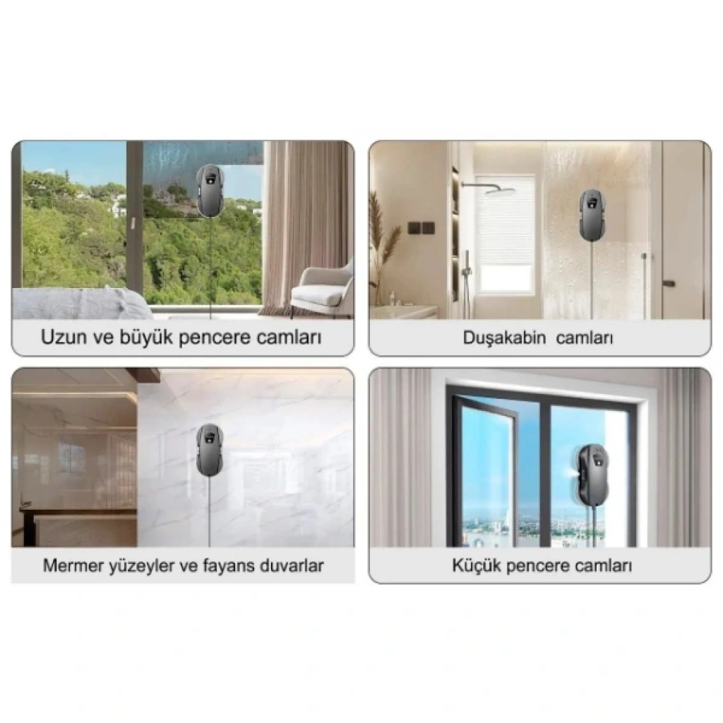 CAM SİLME ROBOTUÜrün Özellikleri Cam Silme Robotu, pencereleri elle temizleme zahmetini ortadan kaldıran gelişmiş ve tamamen otomatik bir temizlik robotudur. Sağ-sol, sol-sağ ve yukarı-aşağı olmak üzere 3 farklı çalışma moduna sahiptir ve dar alanlara kolayca uyum sağlayarak cam yüzeylerde kusursuz temizlik performansı sunar. Vakum teknolojisi sayesinde yüzeye güvenli şekilde tutunur, camları silerken aynı anda temizleme ve parlatma işlemlerini gerçekleştirir. Geniş yüzeylerde olduğu kadar balkon camları, yüksek pencereler ve zor erişilen alanlarda da etkili çalışır. İçerisinden çıkan güvenlik halatı ile yüksek camlarda ekstra güvenlik sağlar. Şarjlı yapısı, özel temizleme bezleri ve sprey şişesiyle birlikte hijyenik ve pratik bir kullanım sunar. Ev, ofis ve mağaza vitrinlerinde cam temizliğini kolaylaştıran güçlü ve modern bir çözümdür. Paket İçeriği 1 Adet Cam Silme Robotu 1 Adet Güç Adaptörü 1 Adet Güvenlik Halatı 1 Set Temiz Bez Yedekleri 1 Adet Sprey Şişesi