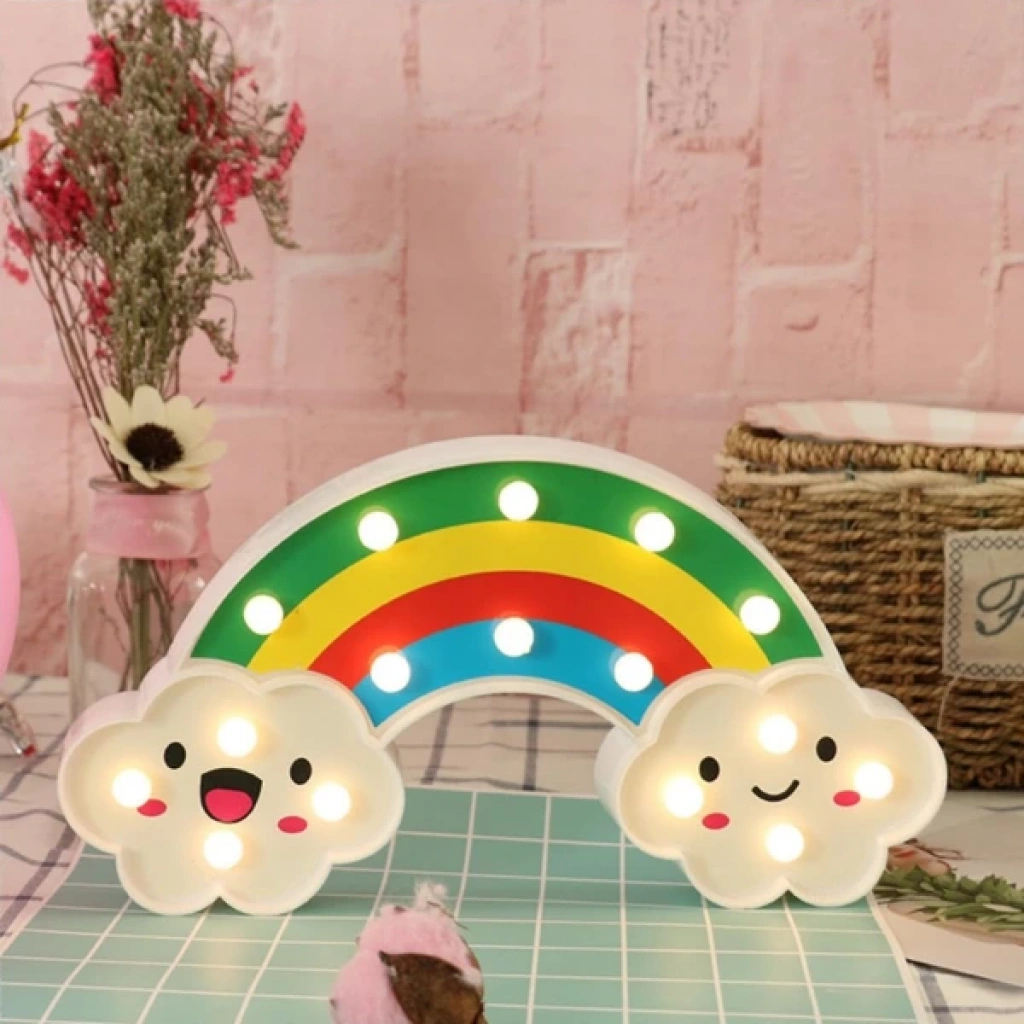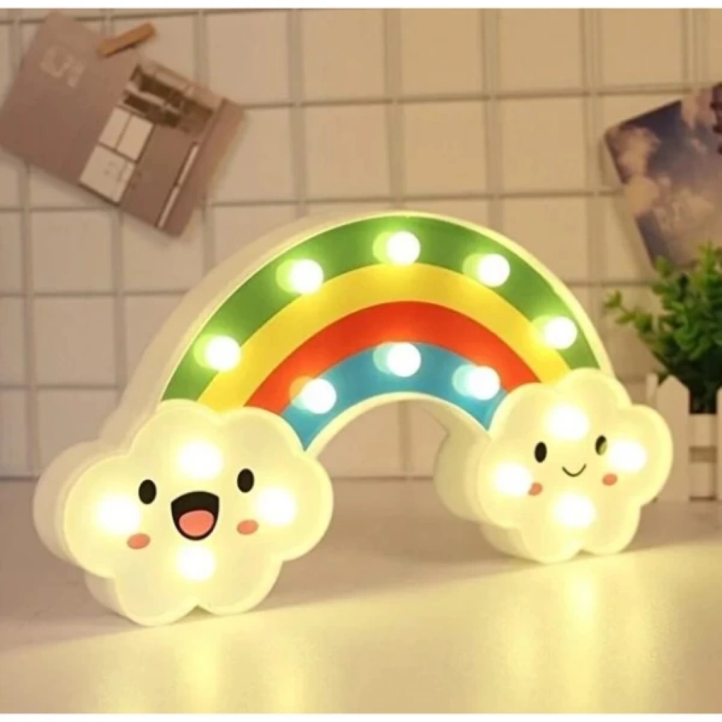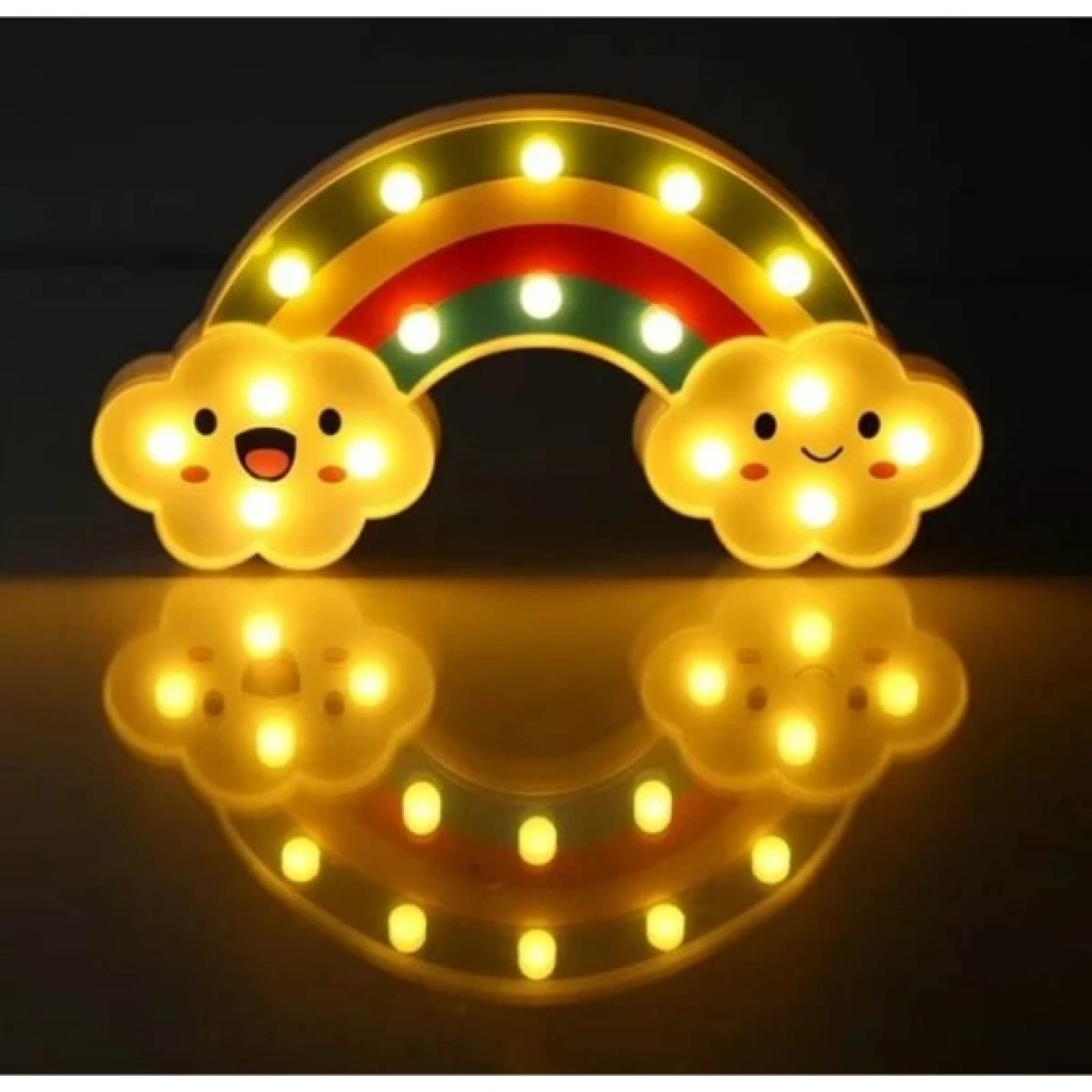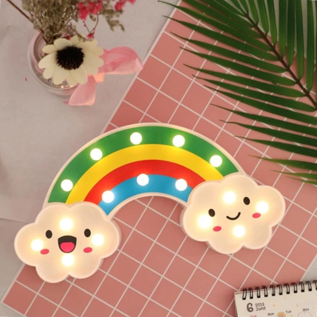 GÜLEN BULUTLU GÖKKUŞAĞI LED GECE LAMBASIÜrün Özellikleri Gülen Bulutlu Gökkuşağı LED Gece Lambası, çocuk odalarına neşe ve huzur katmak için tasarlanmış dekoratif ve işlevsel bir aydınlatmadır. 30x16 cm boyutundaki bu şirin gece lambası, gökkuşağı formu ve gülen bulut figürleriyle hem sevimli bir aksesuar hem de yumuşak ışığıyla rahatlatıcı bir gece arkadaşıdır.Arkasında bulunan asma yerleri sayesinde dilerseniz duvara monte edebilir, dilerseniz masa üstünde kullanabilirsiniz. Kalem pil ile çalışır ve piller pakete dahil değildir. Gün ışığı rengindeki yumuşak LED ışıkları göz yormaz, loş bir ambiyans oluşturarak çocukların daha huzurlu uyumasına yardımcı olur. Ayrıca enerji tasarruflu yapısıyla uzun süreli kullanım sağlar.Hem çocukların odasında dekoratif bir obje olarak hem de gece lambası ihtiyacını karşılayan bu ürün, şirin tasarımıyla eğlenceli ve güvenli bir ortam oluşturur. Sevdiklerinize hediye edebileceğiniz ideal bir seçenek olarak da öne çıkar. Paket İçeriği 1 adet Gülen Bulutlu Gökkuşağı LED Gece Lambası