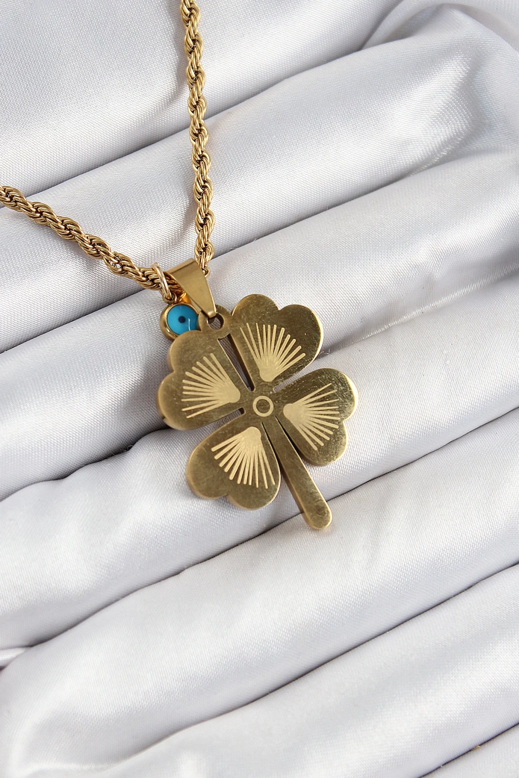 HarmonyAura 316L Çelik Burgu Zincirli Nazar Detaylı Yonca Model Gold Renk Kadın Kolye