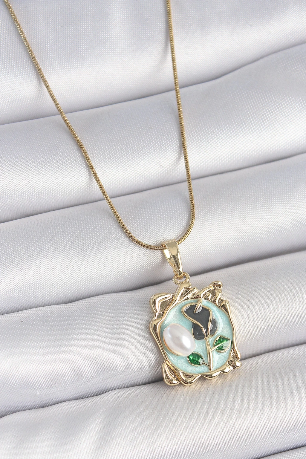 HarmonyAura 316L Çelik Gold Renk Zincir Mavi Mineli Çiçek İşlemeli İnci Detay Portre Model Kadın Kolye