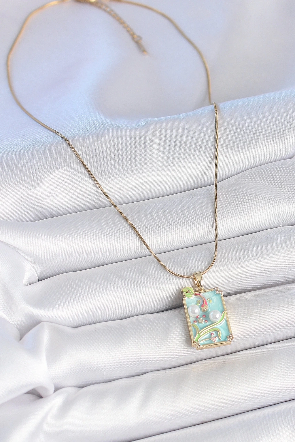 HarmonyAura 316L Çelik Gold Renk Zincir Mavi Mineli İncili Çiçek İşlemeli Portre Model Kadın Kolye