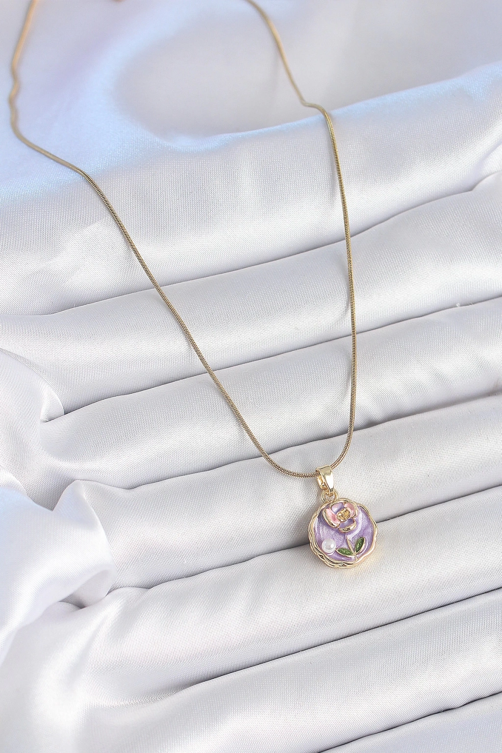 HarmonyAura 316L Çelik Gold Renk Zincir Mor Minimal Çiçek İşlemeli İnci Detay Portre Model Kadın Kolye