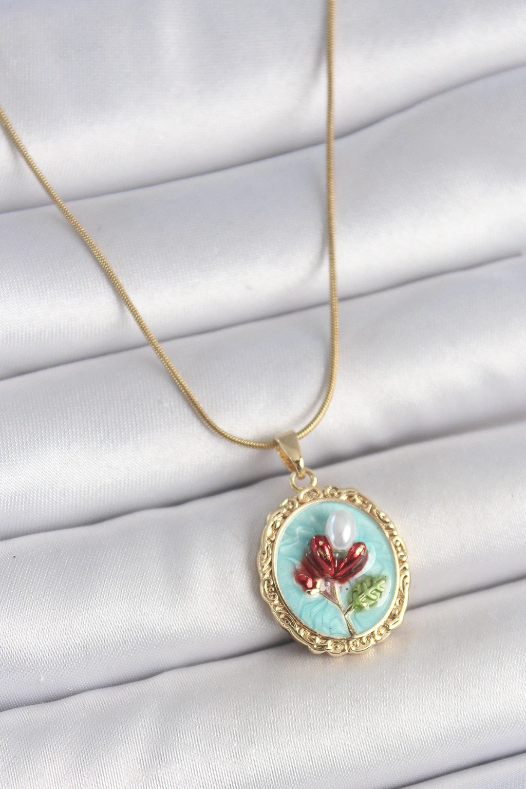 HarmonyAura 316L Çelik Gold Renk Zincir Turkuaz Mineli İncili Çiçek İşlemeli Portre Model Kadın Kolye