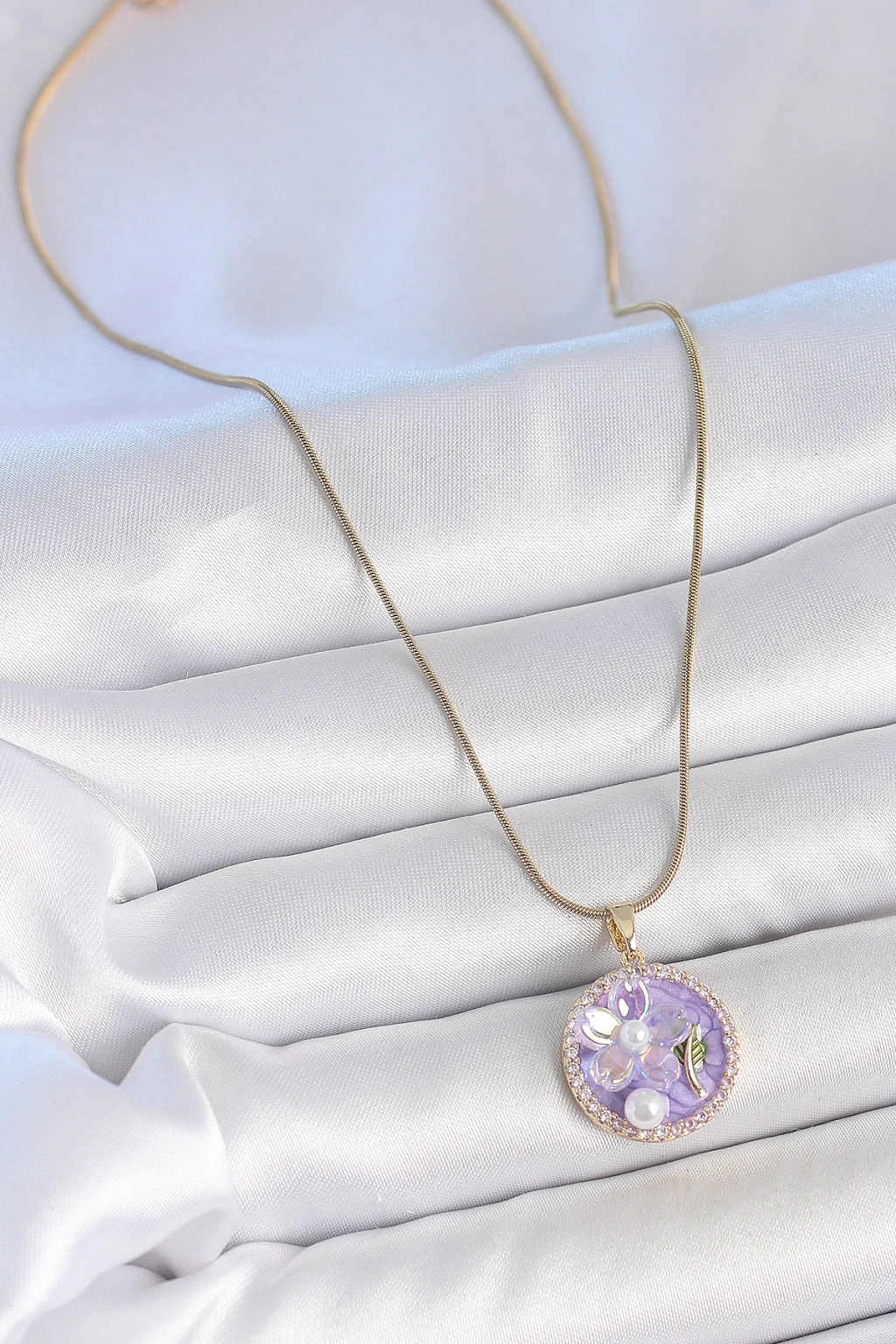 HarmonyAura 316L Çelik Gold Renk Zincir Zirkon Taşlı Mor Mineli Çiçek İşlemeli İnci Detay Portre Model Kadın Kolye