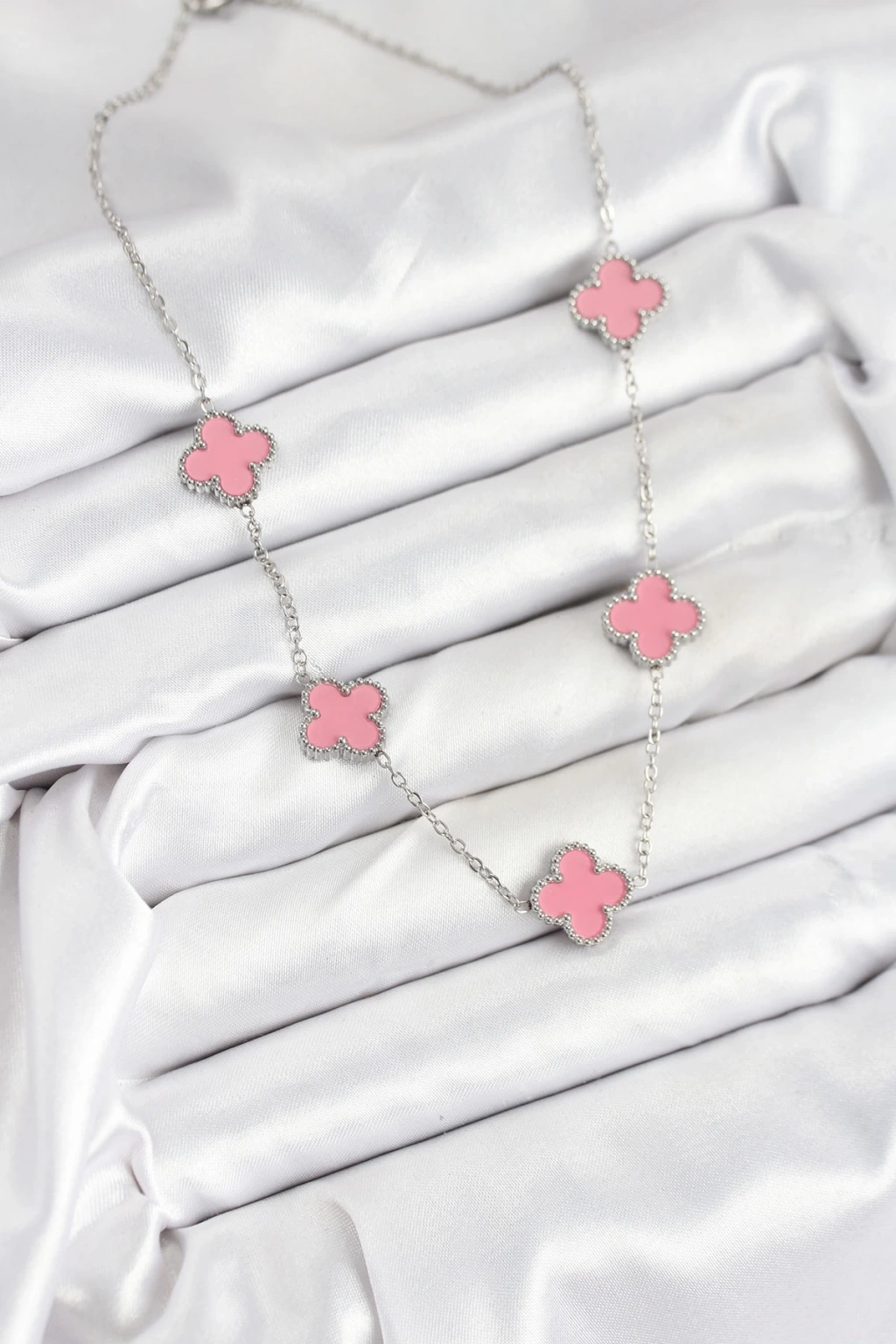 HarmonyAura 316L Çelik Zincir Gümüş Pembe Renk Yonca Kadın Kolye