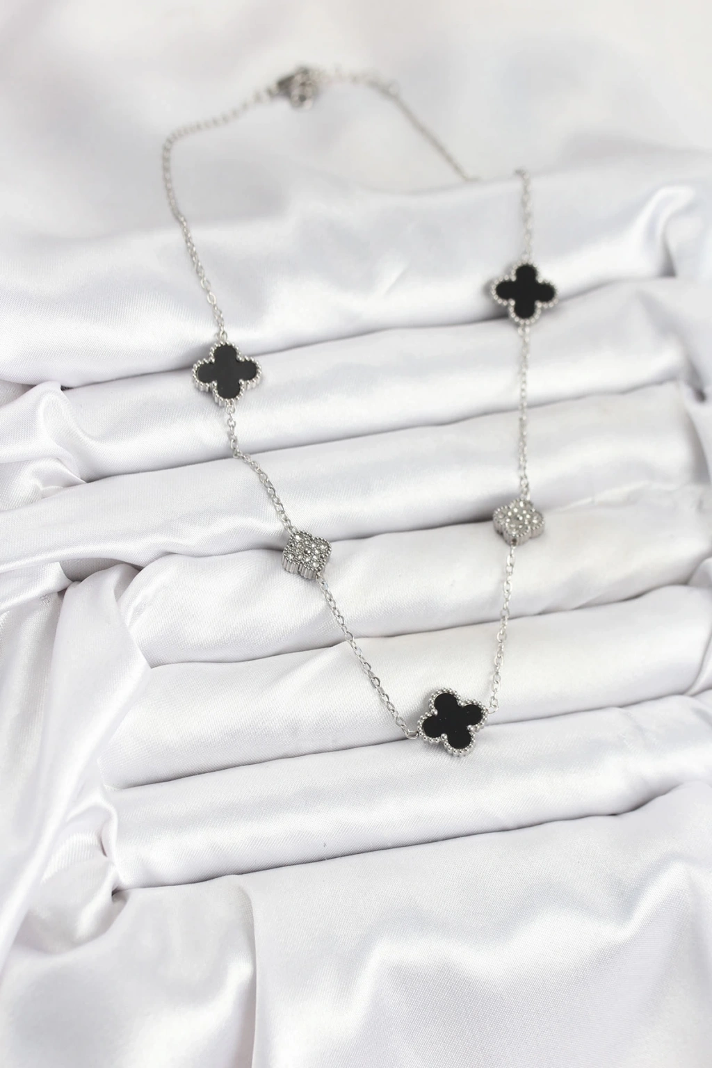 HarmonyAura 316L Çelik Zincir Gümüş Renk Siyah ve Zirkon Taşlı Yonca Kadın Kolye