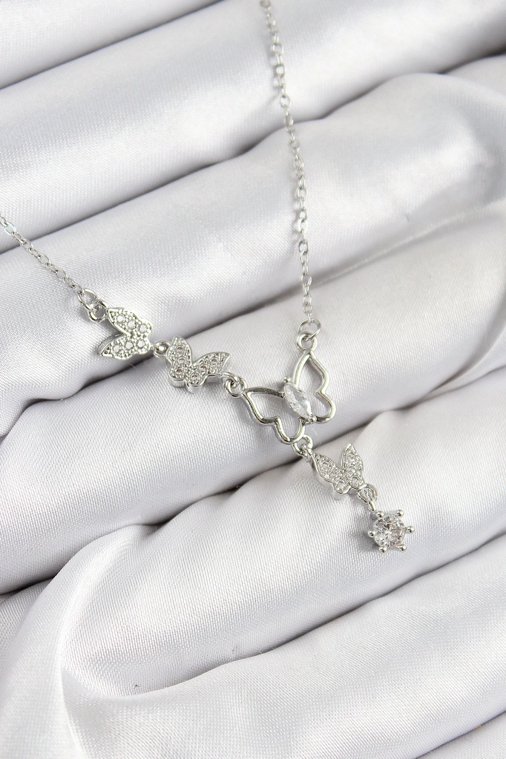 HarmonyAura 316L Çelik Zirkon Taşlı Kelebek Model Gümüş Renk Kadın Kolye