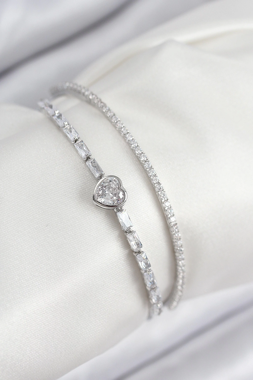 HarmonyAura Pirinç Zirkon Taşlı Kalp Model Gümüş Renk Kadın Bileklik