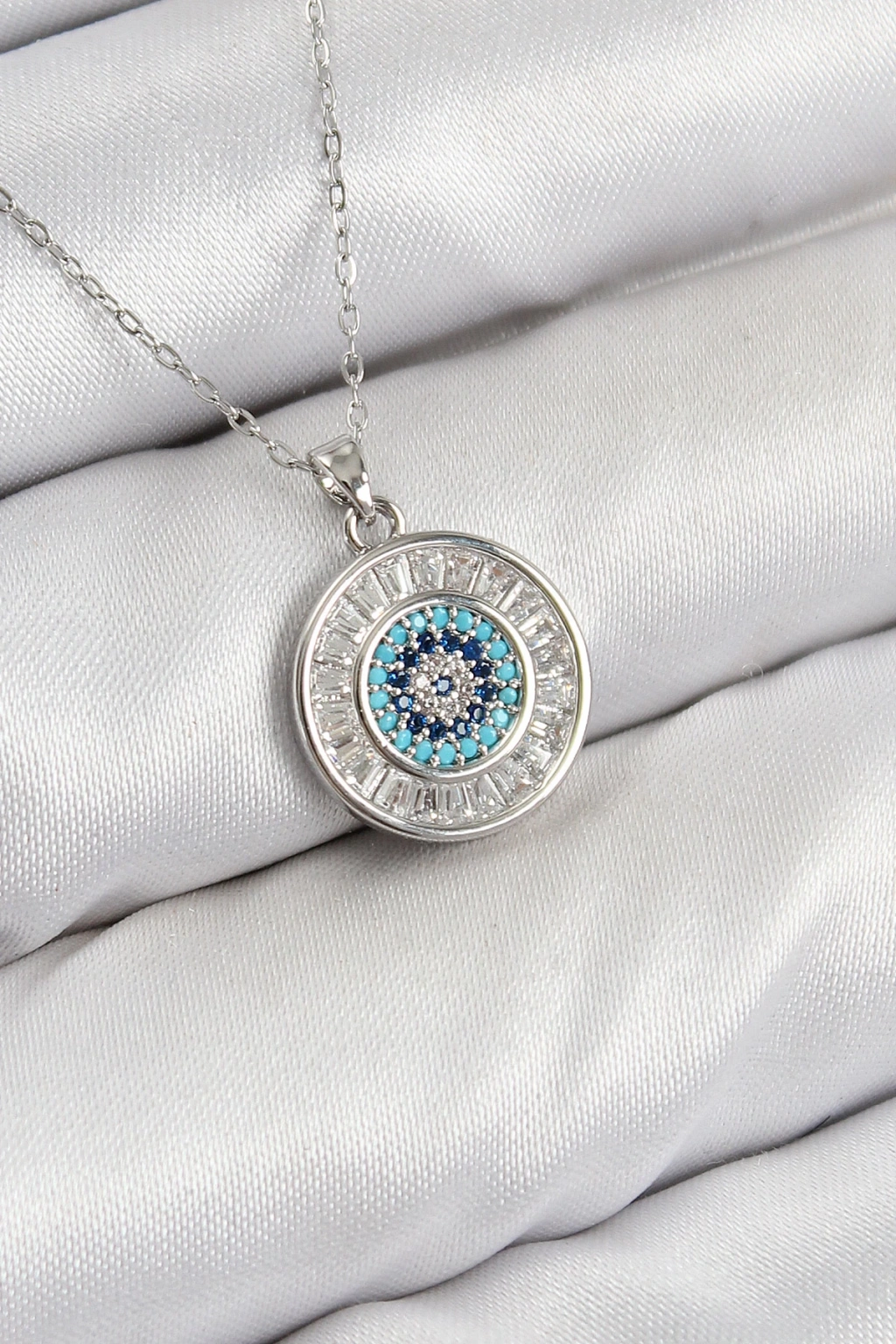 HarmonyAura Pirinç Zirkon Taşlı Su Yolu Nazar Model Gümüş Renk Kadın Kolye