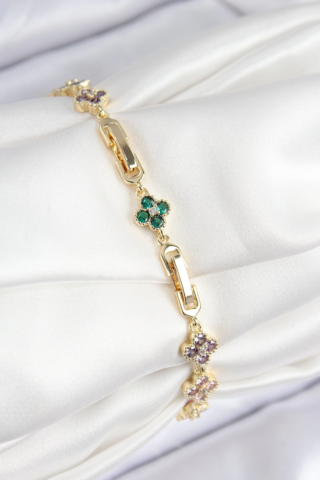 HarmonyAura VIP Pirinç Renkli Zirkon Taşlı Yonca Model Gold Renk Kadın Bileklik