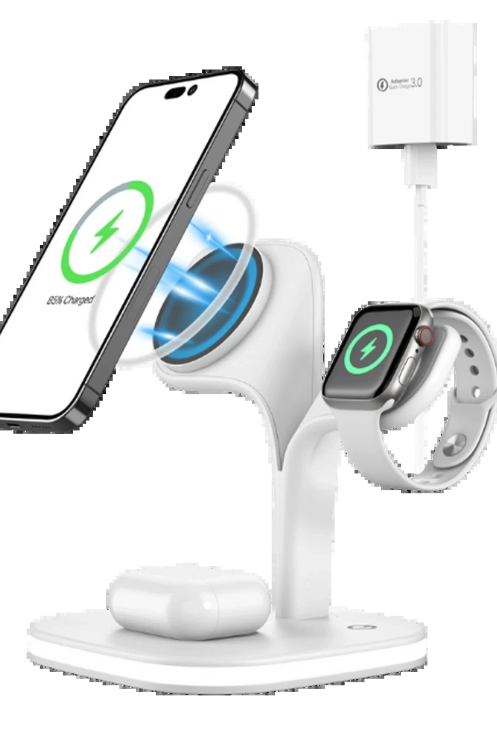 Phone, AirPods, iWatch ve ek Qi uyumlu cihazları aynı anda şarj ederek verimliliğinizi artırır.