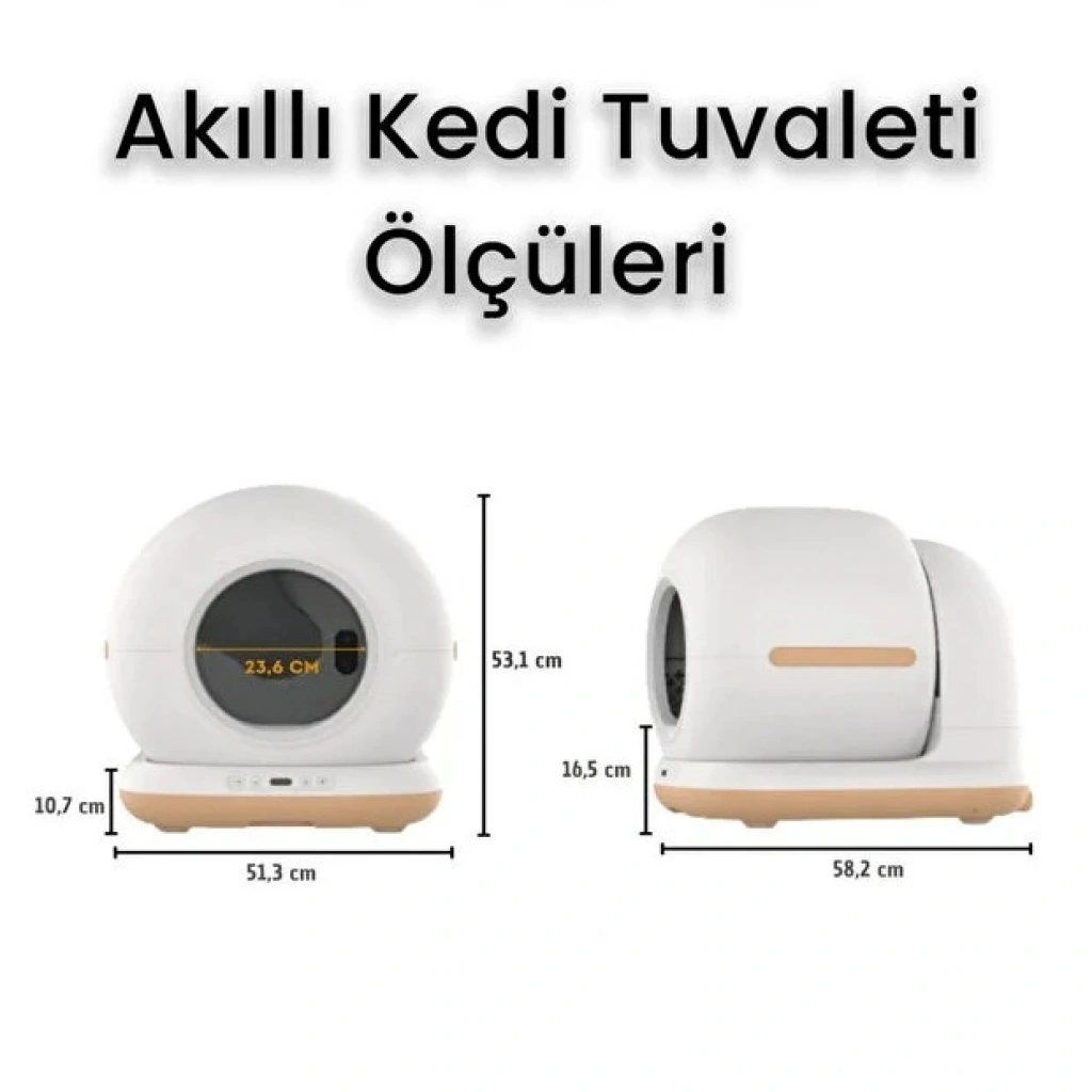 HD KAMERALI AKILLI KEDİ TUVALETİÜrün Özellikleri HD Kameralı Akıllı Kedi Tuvaleti, modern evcil hayvan bakımını bir üst seviyeye taşıyan gelişmiş teknolojisiyle hem sizin hem de kedinizin yaşam konforunu artırmak için tasarlanmıştır. Tam otomatik temizleme sistemi, günlük kum temizliği ihtiyacını ortadan kaldırarak zamandan büyük tasarruf sağlar ve yoğun yaşam temposunda dahi kedinizin hijyenini kusursuz şekilde korur. 75 litrelik geniş iç hacmi, sık kum boşaltma gereksinimini azaltır ve 12 kg’a kadar tüm kediler için rahat kullanım sunar. Geniş giriş açıklığı 23.6 cm olan bu akıllı tuvalet, 51.3 cm genişlik, 58.2 cm derinlik ve 53.1 cm yüksekliği ile kedinizin kendini güvende hissedeceği ferah bir alan oluşturur.Entegre UV sterilizasyon sistemi, bakteri ve mikroorganizmaları etkili şekilde yok ederek kum kabının her kullanım sonrasında hijyenik kalmasını sağlar. Bu özellik, özellikle idrar yolu enfeksiyonlarına yatkın kediler için ek bir güvenlik sunar. Wi-Fi bağlantısı ile çalışan sistem, mobil uygulama üzerinden uzaktan yönetilebilir ve HD kamerası sayesinde kedinizin tuvalet kullanımını anlık olarak izlenebilir. Uygulamadaki idrar takip fonksiyonu, idrar yolu tıkanıklığı gibi ciddi sağlık problemlerinin erken fark edilmesini sağlayarak kedinizin sağlığını korur.Kapalı tasarımı sayesinde koku kontrolünü maksimum seviyeye çıkarır ve evinizin havasını temiz tutar. Titreşim önleyici taban yapısı 10.7 cm yüksekliğiyle dengeli bir duruş sunarken, 16.5 cm taban yüksekliği iç mekan konforunu en üst düzeye taşır. Sağlam ve yüksek kalite malzemelerden üretilen bu akıllı tuvalet, uzun ömürlü bir kullanım sunarak uluslararası kalite standartlarını karşılayan dayanıklı bir yapıya sahiptir. Evcil hayvan bakımını kolaylaştırmak isteyen herkes için ideal, yenilikçi ve güvenilir bir çözümdür. Paket İçeriği 1 Adet HD Kameralı Akıllı Kedi Tuvaleti