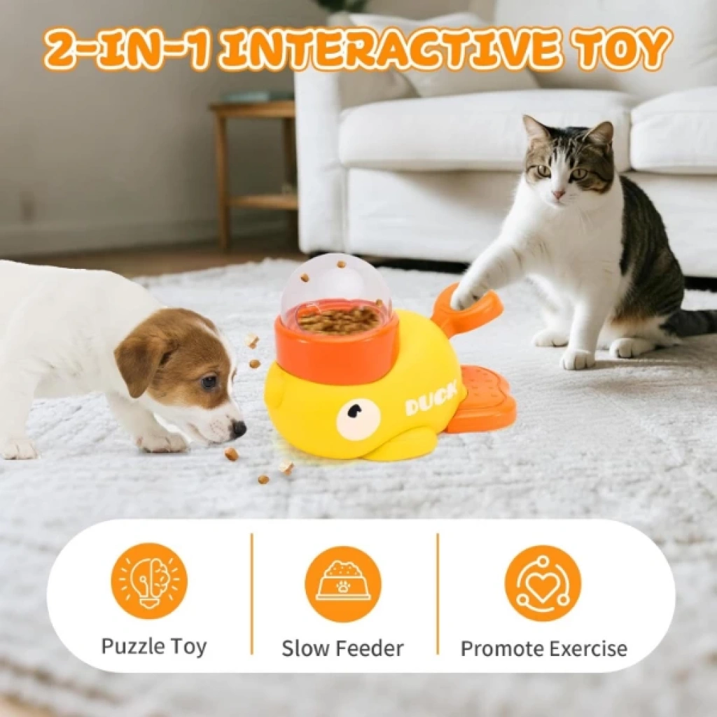 İNTERAKTİF EVCİL HAYVAN ÖDÜL MAMASI OYUNCAĞIÜrün Özellikleri İnteraktif evcil hayvan ödül maması oyuncağı, kedi ve köpeklerin zihinsel gelişimini desteklerken aynı zamanda eğlenceli bir oyun deneyimi sunar. Ödül maması haznesi, hayvanınızın oyuncağı hareket ettirmesiyle mamaların yavaş yavaş çıkmasını sağlar ve bu sayede hem eğlenir hem de yavaş beslenir. Dayanıklı, toksik madde içermeyen ABS plastik malzeme ile üretilmiştir. Kaymaz alt tabanı sayesinde yüzeyde sabit durur ve çevreye zarar vermez. Hem egzersiz hem zeka geliştirme amacıyla kullanılabilir. Ördek şeklindeki sevimli tasarımıyla dikkat çeker ve hayvan dostlarınızın ilgisini çeker. Kedi ve küçük ırk köpekler için uygundur, mama ödülleriyle oynarken aktif kalmalarına yardımcı olur. Paket İçeriği 1 adet interaktif evcil hayvan ödül maması oyuncağı