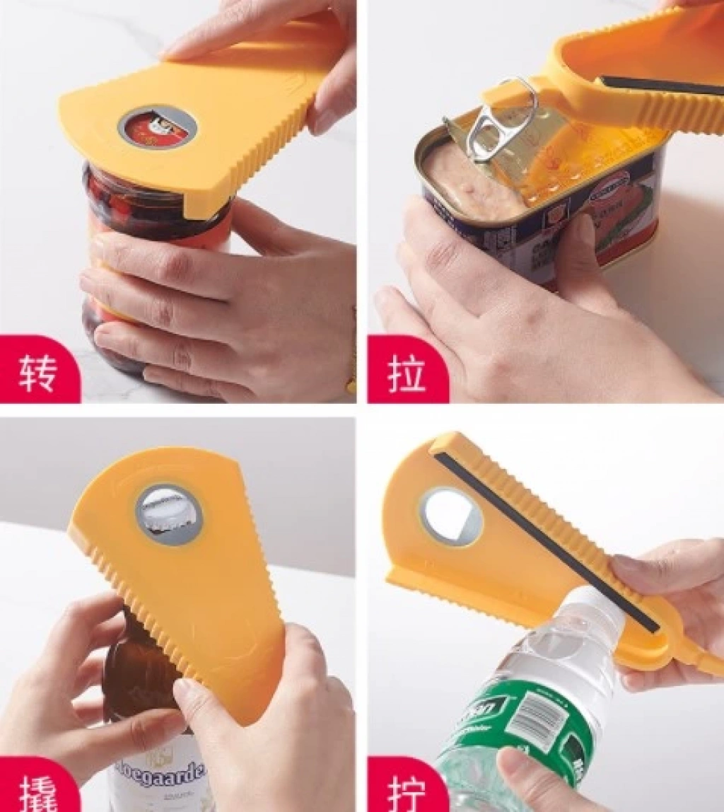 • V-şekilli tasarım, büyük ve küçük şişe kapakları açılabilir.Yaklaşık 3 cm ile 7 cm arası kavanoz ve şişe kapakları için uygundur.Çok fonksiyonlu şişe açacağı: inatçı kutu veya plastik şişeleri açın, çekme halkası ile konserveleri çekin, kapağı çıkarı