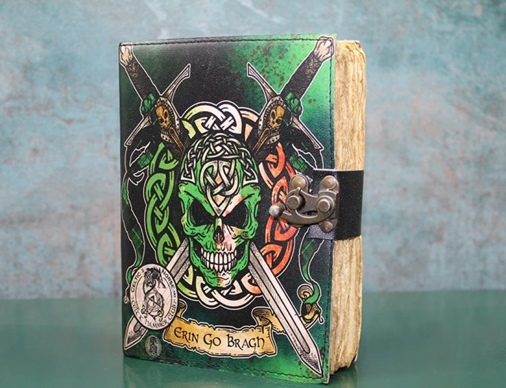KURUKAFA DERİ DEFTERÜrün ÖzellikleriKurukafa Deri Defter, kurukafa, kılıç ve keltik semboller kullanılarak tasarlanmış çizimli bir defterdir. Deri kapak, cesur ve özgün bir tarzı simgeleyen kurukafa figürü ve kılıç, keltik semboller ile detaylandırılmıştır. Bu tasarım, derin anlam ve sanatsal bir hava taşır. 18x13 cm ölçülerindeki boyutu, günlük kullanım için uygun olan rahat bir yazı alanı sunar. Hem kişisel kullanım hem de hediye olarak mükemmel bir tercihtir.Paket İçeriği1 adet Kurukafa Deri Defter.