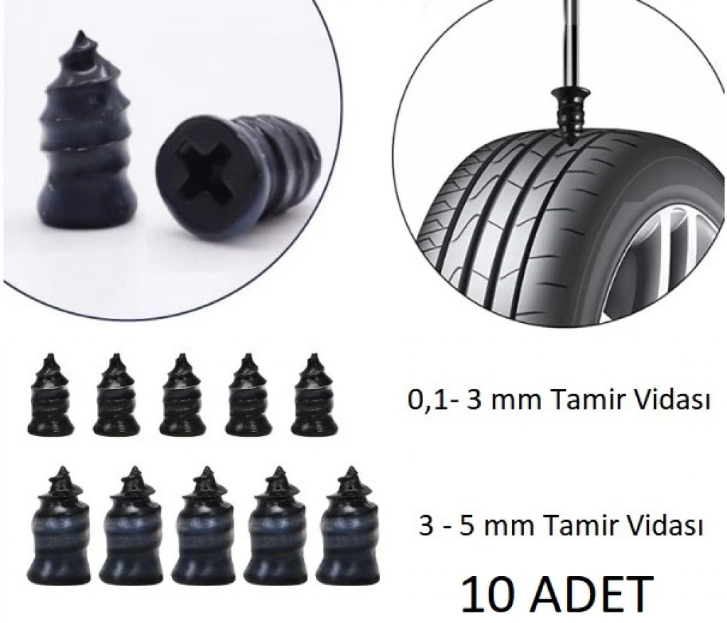 LASTİK TAMİR KİTİ KAUÇUK VİDA SETİ1. Lastiğe zarar vermez, hava kaçağı olmaz. Lastik yarasına tamir vidasını takarak basit ve verimli bir lastik onarımı sağlayabilirsiniz.2. Lastikte  yüksek bağlantı mukavemetine ve iyi sızdırmazlık performansına sahiptir,.3. Kullanımı kolay, bu lastik tamir vidası ile kendiniz lastik tamir edebilir, bir oto tamir dükkanı bulmaya gerek yoktur, ekonomik ve zaman tasarrufu sağlar.4. Yaygın olarak kullanılan alanları, profesyonel delinme tamir vidası olarak, otomobil, motosiklet, kamyon, otobüs ve tarım lastikleri için kullanılabilir.Paket içeriği ve Uygulama kapsamı:5 adet Küçük boyut: 0.1mm-3 mm için kullanılabilir5 adet Büyük boy: 3 mm-5 mm için kullanılabilirMalzeme: kauçuk