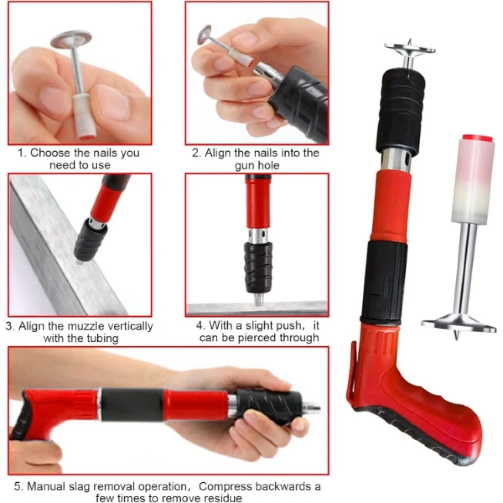 MANUEL ÇİVİ TABANCASIÜrün Özellikleri Manuel Çivi Tabancası, genellikle ahşap, çelik veya beton yüzeylere çivi, dübel veya perçin yerleştirmek için kullanılan pratik bir el aletidir. Ürünün üst kısmında yer alan siyah ayar halkası sayesinde 3 farklı kuvvet seviyesi (vites) seçilebilir. Bu, yüzeyin sertliğine göre sabitleme işlemini optimize eder:1. Vites: Daha yumuşak yüzeyler ve küçük çiviler için uygundur.2. Vites: Orta sertlikte yüzeylerde kullanılabilir.3. Vites: Sert yüzeyler (beton/metal) için yüksek darbe kuvveti sağlar. Kavrama alanı kaymaz ve ele tam oturur, uzun süreli kullanımda bile rahatlık sunar. Ürün, yaylı sistemle çalışır ve perçinleme esnasında yüksek ses çıkarmadan işlem yapılmasına imkân tanır. Aletin ucu, tam isabetli çalışmak üzere tasarlanmıştır, bu sayede çiviler düzgün şekilde yüzeye yerleştirilir. Paket İçeriği 1 Adet Manuel Çivi Tabancası