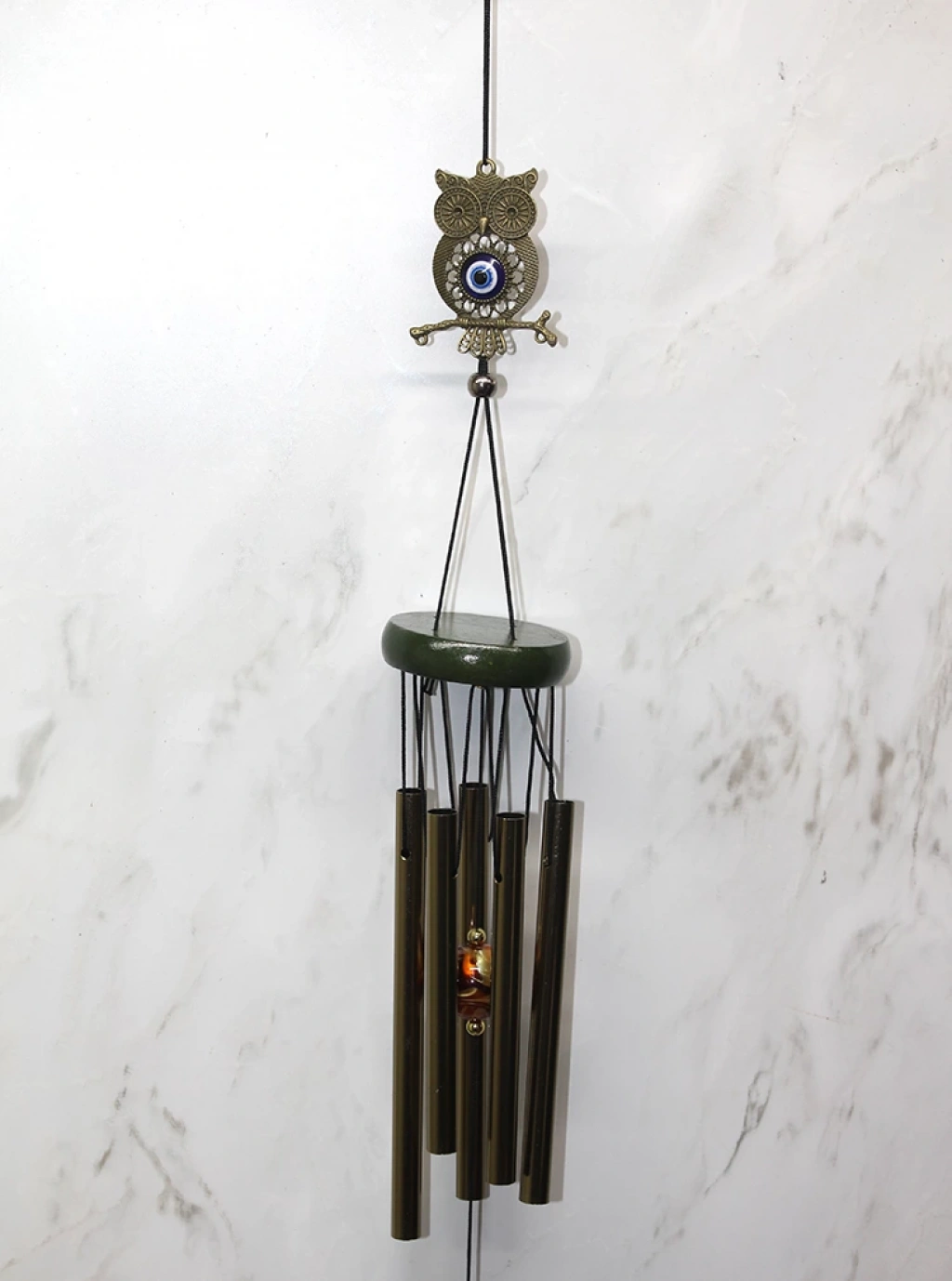 METAL RÜZGAR ÇANI MODEL 12Ürün Özellikleri Metal Rüzgar Çanı Model 12, zarif ve estetik tasarımıyla ev, balkon veya bahçenize huzurlu bir atmosfer katar. Üzerindeki baykuş figürü ve nazar boncuğu detayı, kötü enerjiyi uzaklaştırdığına inanılan geleneksel bir sembol ile birleşerek dekoratif bir obje sunar. Metal boruları hafif rüzgarla hareket ederek rahatlatıcı bir melodi oluşturur. Dayanıklı malzemesi sayesinde uzun ömürlüdür ve iç ve dış mekân kullanımı için uygundur. Paket İçeriği 1 Adet Metal Rüzgar Çanı