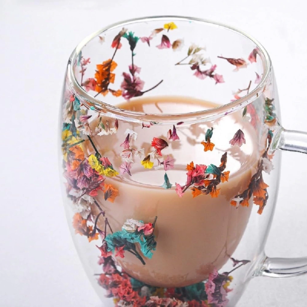 • ORJİNAL KURUTULMUŞ ÇİÇEKLİ KUPA BARDAKÇift camlı kupa bardak, şık ve dayanıklı bir tasarıma sahiptir. İçerisinde özenle yerleştirilmiş kurutulmuş orijinal çiçekler, bardağa görsel bir estetik katmaktadır. Çift camlı yapısı içeceğin sıcak veya soğuk o