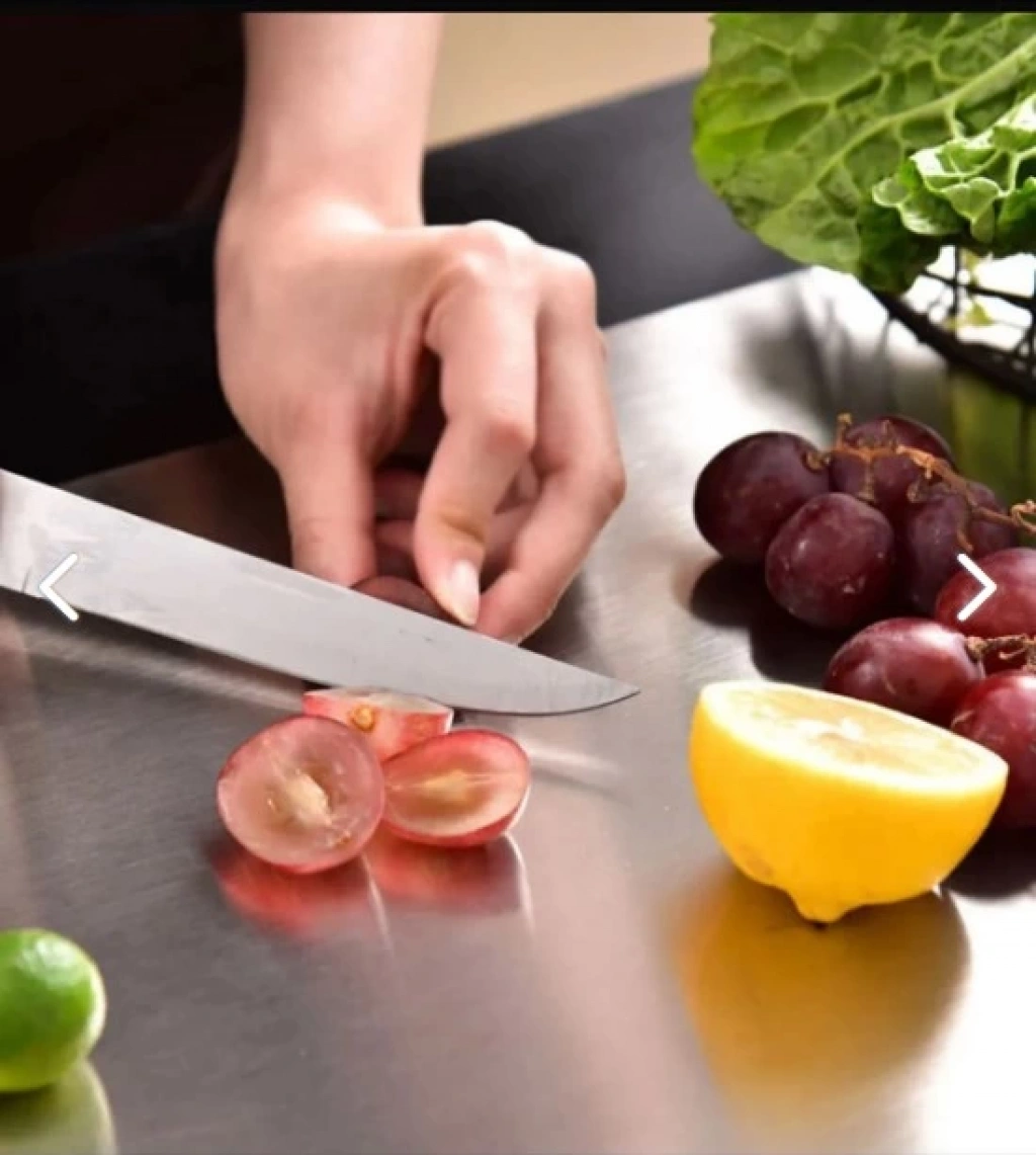 • Paslanmaz Çelik Kesim PanosuÜrün Açıklaması:Dayanıklı ve şık paslanmaz çelik kesim panosu, mutfağınızda hijyen ve uzun ömürlülük sunar. Kolay temizlenebilir yüzeyi ve kaymaz yapısı ile güvenli ve pratik kullanım sağlar. Sebzelerden et ürünlerine kada