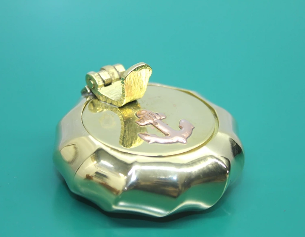 PİRİNÇ ÇAPALI KAPAKLI KÜLLÜKÜrün ÖzellikleriDayanıklı pirinç malzemeden üretilen çapalı kapaklı küllük, 5 cm çapındadır. Denizcilik temalı çapalı tasarımıyla hem şık hem de işlevsel bir obje olarak kullanılabilir. Kapaklı yapısı sayesinde sigara küll