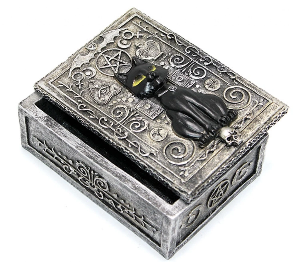 POLYESTER KEDİ TASARIMLI KUTUÜrün ÖzellikleriPolyester Kedi Tasarımlı Kutu, mistik ve gotik tarz sevenler için özel olarak tasarlanmıştır. Üzerinde detaylı bir kedi figürü ve mistik semboller yer almakta olup, antik gri tonlarında işlenmiştir. Dayanıklı polyester malzemeden üretilmiş olan bu kutu, takı ve özel eşyalarınızı saklamak için idealdir. Estetik görünümü sayesinde hem fonksiyonel hem de dekoratif bir obje olarak kullanılabilir. Koleksiyoncular ve mistik tasarımlara ilgi duyanlar için eşsiz bir parçadır.Paket İçeriği1 Adet Polyester Kedi Tasarımlı Kutu
