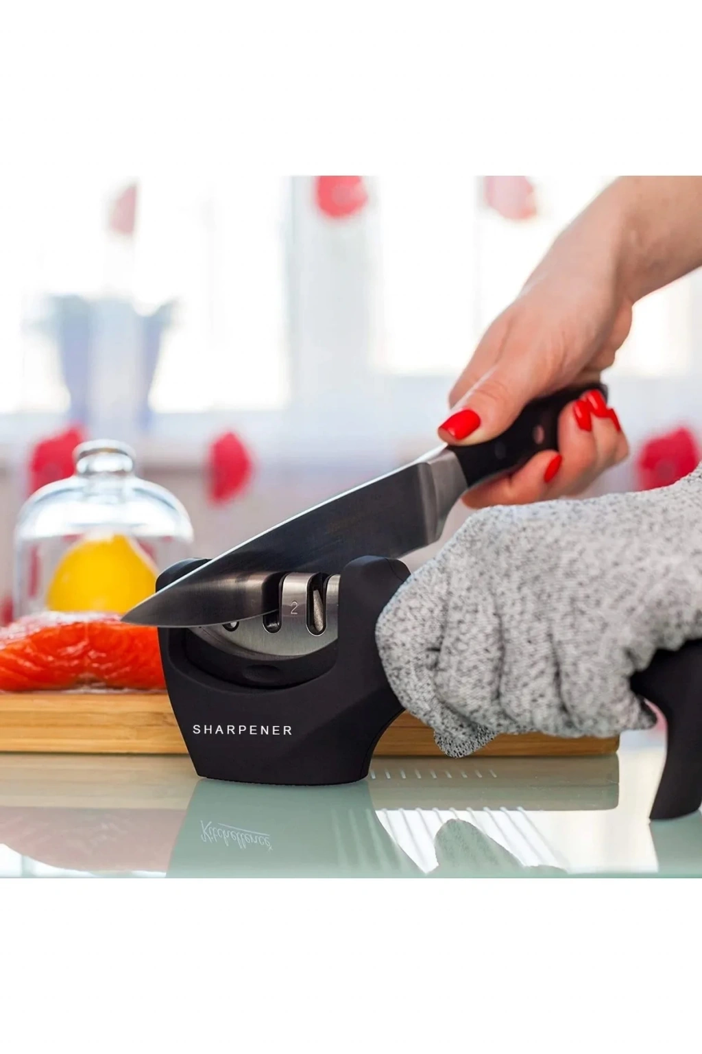 Profesyonel bıçak bileyici 3 açılı elmas seramik tungsten çelik el bıçakları bileme. Mutfak bıçağı bileyici - 3 aşamalı bıçak aksesuar bileme aracı 3 adımlı bıçak bileme sistemi: Inanılmaz 3 yuvalı sistemimizle bıçak bileme sanatında devrim yaratıyoruz! Bıçağı yuvaların her birine yerleştirin ve hızlı ve etkili bir keskinleştirme için bıçağı birkaç kez yavaşça çekin.