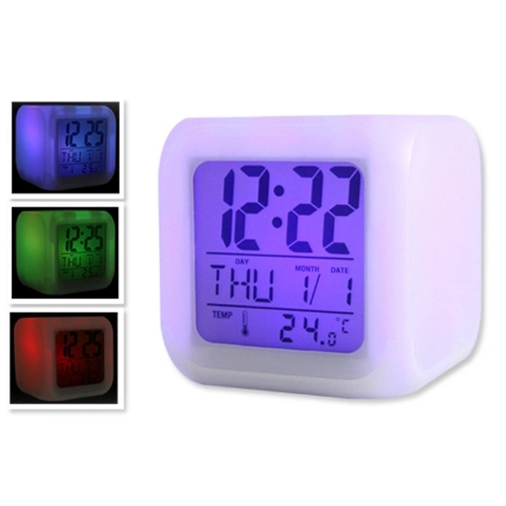 RENK DEĞİŞTİREN KÜP SAAT Etrafına verdiği ışık ve rengi gördükten sonra sıradaki renge geçmesi için sizin de sabırsızlıkla bekleyeceğiniz şüphesiz. Gece saati görmek için dokunmanız yeterli. Tüm gövdesi ve ekranı ile birlikte renk değiştirmektedir. Işığını yakmadan da kullanabilirsiniz. Ürün Özellikleri Renk Değiştirebilen Masa Saati + Termometre + Alarm İsterseniz 7 farklı rengi sürekli değiştirebilen çok hoş bir gece lambası! İsterseniz İki farklı seçenekte renk değiştirebilen masa saati! Sürekli olarak renk değiştirir ya da dilerseniz sadece dokunduğunuzda! Gece saatinizi görmek için dokunmanız yeterli! Tüm gövdesi ve ekranı ile birlikte renk değiştirmektedir! Işığını yakmadan da kullanılabilir! 4 adet ince kalem pil (AAA) ile çalışır. (Piller pakete dahil değildir) Paket İçeriği 1 Adet Renk Değiştiren Küp Saat