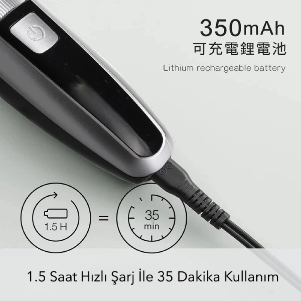 ŞARJLI AYARLANABİLİR SAÇ VE SAKAL TIRAŞ MAKİNESİÜrün ÖzellikleriSaç ve sakal tıraş makinesi, güçlü 3.7V yüksek performanslı motoru sayesinde sert ve yoğun saç tellerinde bile pürüzsüz kesim sağlar. Profesyonel kesim bıçakları, geniş uç yapısı ile daha fazla saç telini tek seferde yakalayarak zamandan tasarruf etmenizi sağlar. Makine, ıslak ve kuru kullanım için uygundur ve IPX6 su geçirmezlik seviyesiyle tamamen yıkanabilir, kolayca temizlenir. 2 farklı tarakla (1–10 mm / 11–20 mm aralığında, 38 seviye ayarlanabilir uzunluk) her saç ve sakal stiline uygun hassas kesim yapılabilir. Dokunmatik açma-kapama tuşu ve hızlı ayar düğmesi, pratik kullanım sunar. LED göstergesi şarj, düşük pil ve tam dolum durumlarını net bir şekilde gösterir. Güçlü 350mAh lityum batarya sayesinde 1,5 saatte tam şarj olur ve 4 saate kadar kesintisiz kullanım sağlar. USB girişi ile evde, ofiste veya seyahatte kolayca şarj edilebilir. Paket İçeriği 1 adet Hyundai PHT-048 tıraş makinesi 2 adet ayarlanabilir tarak başlığı 1 adet USB şarj kablosu 1 adet bakım fırçası