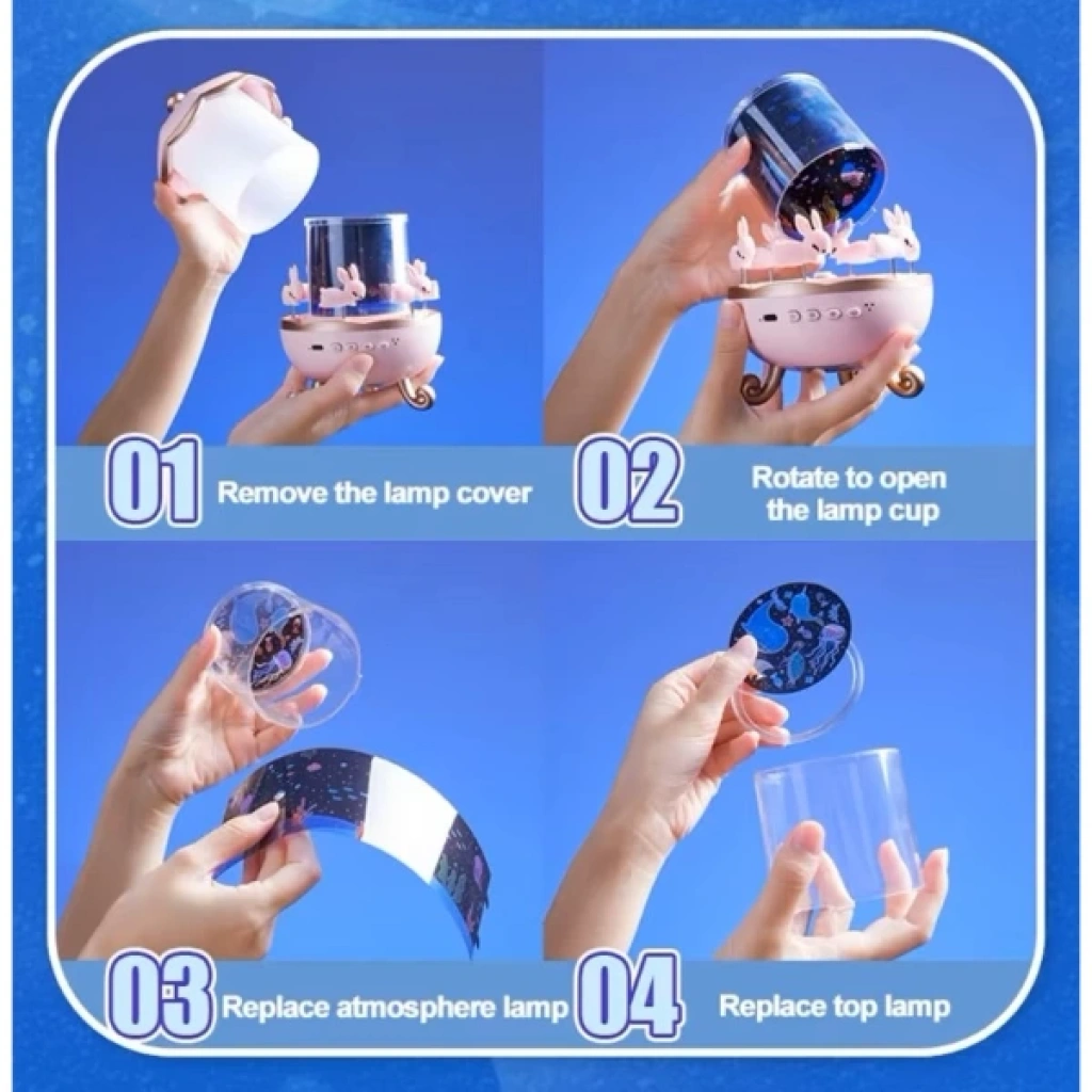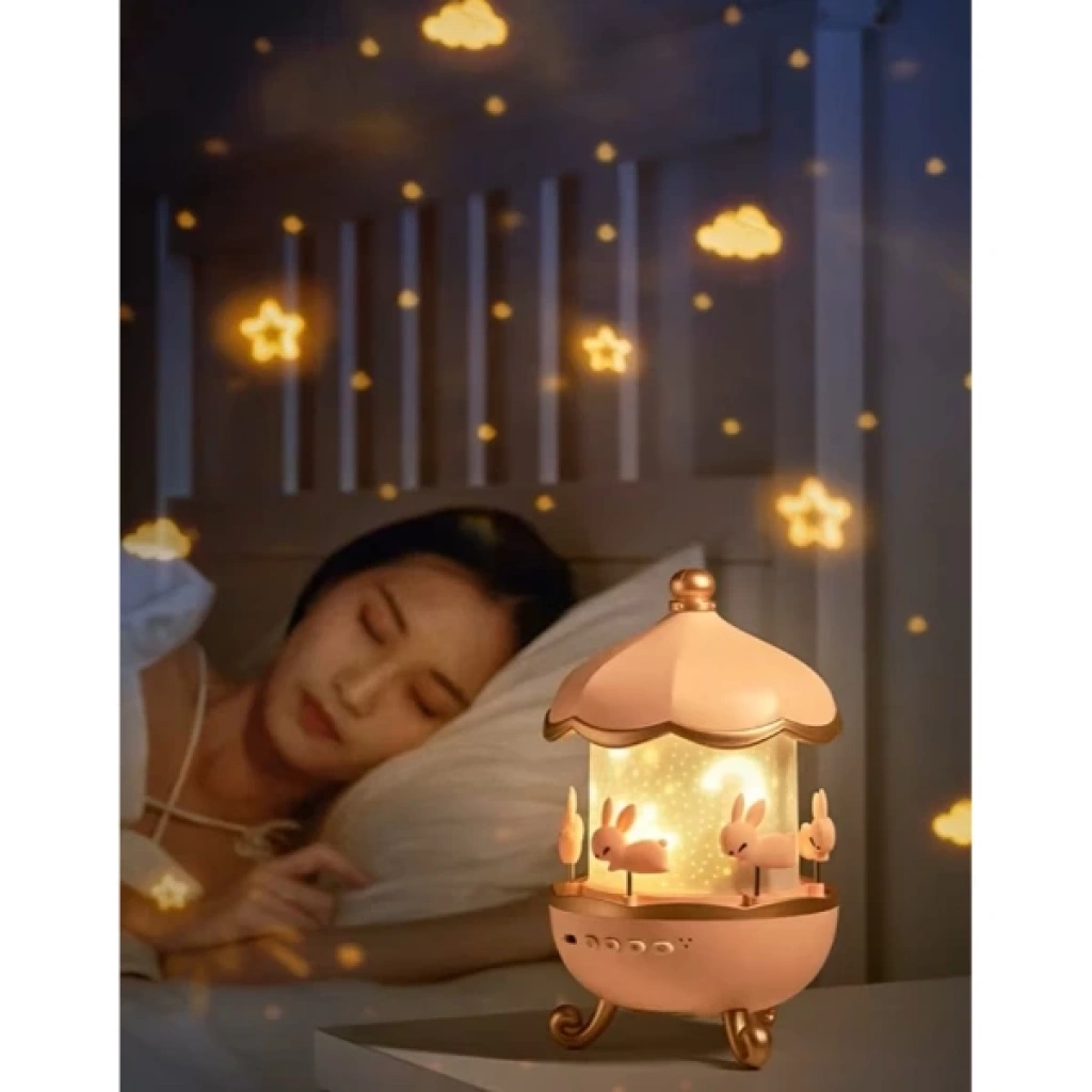 TAVŞAN ATLIKARINCA MULTİFONKSİYON PROJEKTÖRÜrün Özellikleri Tavşan Atlıkarınca Multifonksiyon Projektör, müzik kutusu olarak da çalışabilen ve mobil cihazlar ile Bluetooth üzerinden müzik çalabilen bir üründür. Üst kısmındaki ve içteki tavşan figürleri döner, geceyi daha eğlenceli hale getirir. Cihaz, farklı ışık seviyeleri sunarak loş, orta ve güçlü aydınlatma seçenekleriyle ortamın aydınlatmasını değiştirir. Sıcak ışık, nötr ışık ve renkli ışık seçenekleriyle atmosferin tarzını değiştirebilirsiniz. Gökyüzü desenleri ve sevimli desenler içeren 12 farklı projeksiyon film diski sayesinde duvar ve tavana yıldızlar veya çeşitli desenler yansıtılabilir. USB ile şarj edilebilen bu projektör, bebek/çocuk odalarında kullanılabileceği gibi, gece lambası, uyku yardımcısı ya da hediye olarak da tercih edilebilir. Paket İçeriği 1 Adet Tavşan Atlıkarınca Multifonksiyon Projektör
