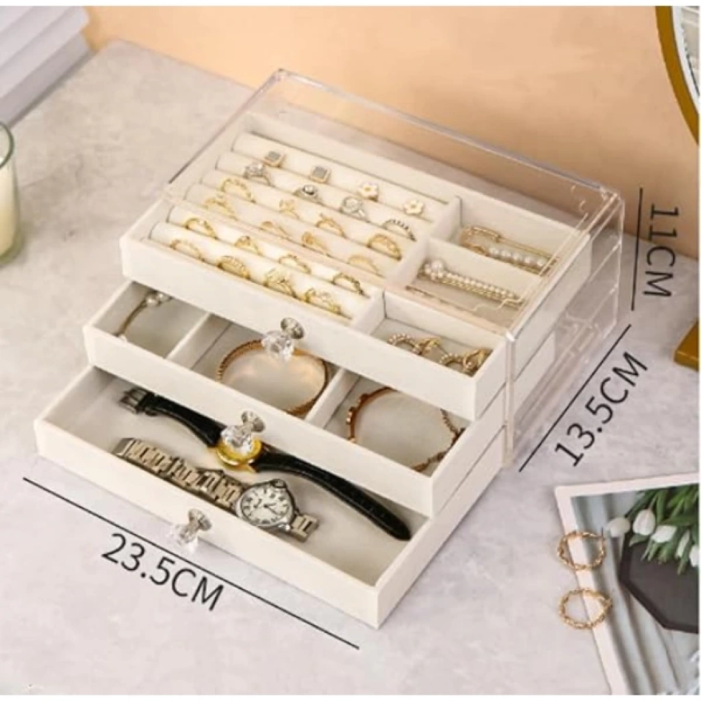ÜÇ KATLI TAKI ORGANİZERİÜrün Özellikleri Üç Katlı Takı Organizeri, üç katlı çekmeceli tasarımı ile farklı türdeki takıların (yüzük, küpe, kolye, bileklik vb.) ayrı ayrı saklanmasına olanak tanır. Kadife kaplı iç bölmeler, takıların çizilmesini önler ve şık bir sunum sağlar. Saydam akrilik dış kapak, tozlanmayı engellerken içeriğin kolayca görünmesini sağlar. Kristal görünümlü çekmece kulpları ise dekoratif bir detay olarak tasarıma zarafet katar. Çok gözlü iç yapısı, küçük aksesuarların karışmadan düzenli bir şekilde durmasını sağlar. Bu düzenleyici kutular, hem evde takı organizasyonu sağlamak hem de makyaj masası veya komodin üzerinde dekoratif bir görünüm oluşturmak için idealdir. Paket İçeriği 1 Adet Üç Katlı Takı Organizeri