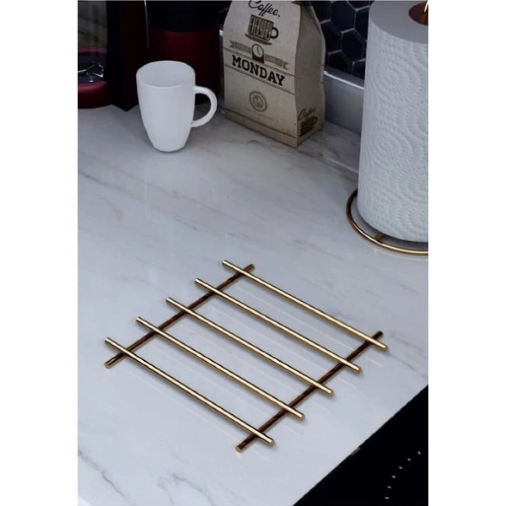 YANMAZ PASLANMAZ ÇELİK NİHALE GOLD RENK Ürün Özellikleri Şık gold rengi ve dayanıklı paslanmaz çelik malzemesi ile üretilen bu yanmaz nihale, mutfaklarda hem estetik hem de işlevsel bir çözüm sunar. 20x20 cm ölçülerindeki kare formu sayesinde geniş tencere ve tavalar için yeterli alan sağlar. Yüksek ısıya dayanıklı yapısıyla sıcak mutfak ekipmanlarını doğrudan tezgaha koymadan önce güvenle kullanabilirsiniz. Kaymaz silikon ayakları sayesinde tezgah yüzeyini korur ve kaymaları önler. Modern ve zarif görünümüyle mutfağınıza zarafet katar. Hem günlük kullanımda hem de misafir ağırlarken pratiklik sağlar. Paket İçeriği 1 Adet Yanmaz Paslanmaz Çelik Nihale Gold Renk