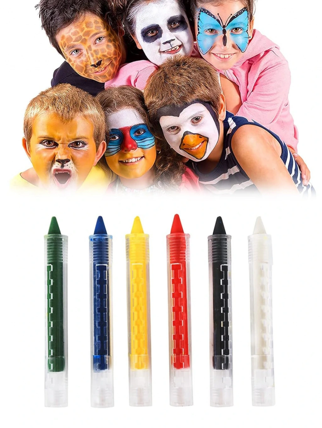 Yüz Boyama Seti Kalemli 6 Renk Bu 6 renkli yüz boyama seti kalemleri ile partilerde, karnavallarda ve özel kutlamalarda kolay ve eğlenceli bir şekilde yüz boyama keyfini yaşayın.Ürün Özellikleri6 renk mevcuttur (yeşil, sarı, kırmızı, mavi, siyah, beyaz)Kullanımı kolay ve pratikCilde zarar vermez Su ve sabun ile kolayca temizlenebilir.Paket İçeriği1 Adet 6'lı Kalem Seti